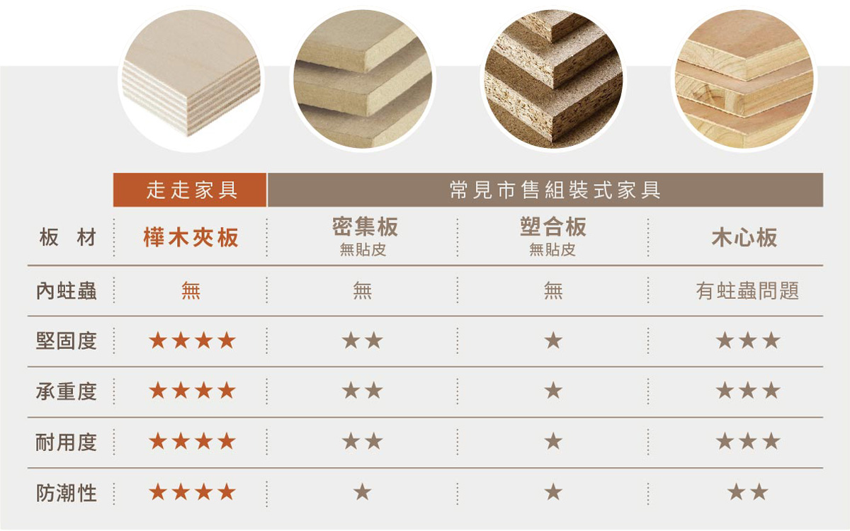 一般夾板的製作方式是將薄版每一層的木紋方向交錯堆疊、黏在一起,有些也會在外側貼皮。雖然夾板的優點是便宜實用,但與十字堆疊交錯熱壓的「樺木夾板」比起來,耐用性就差了不少。我們製作了夾板的比較表,讓你透過下圖更清楚不同夾板的特性。