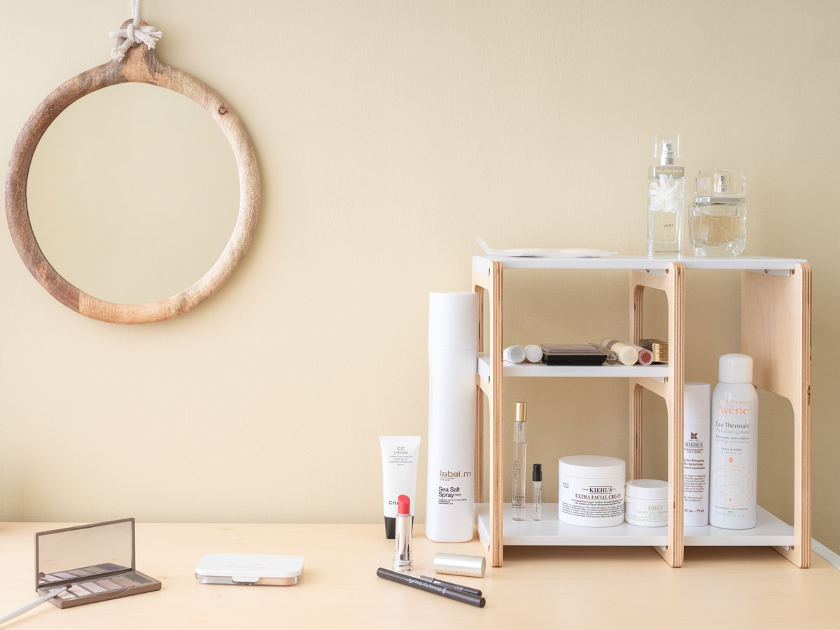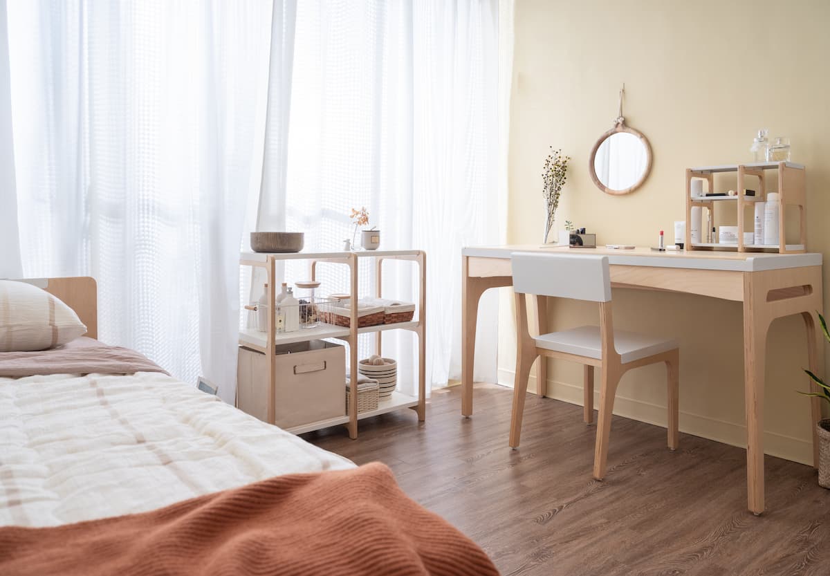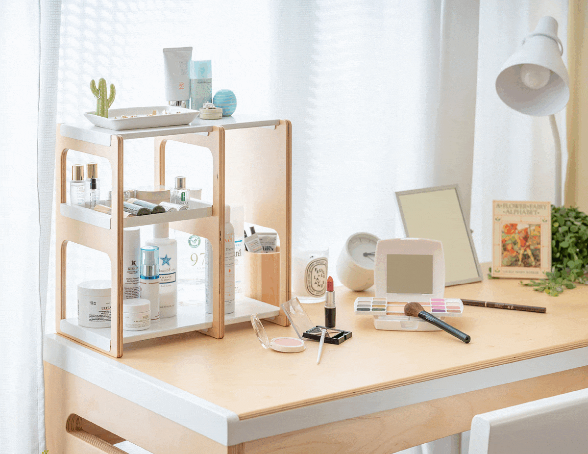 寬敞的大桌面除了能擺放文書、電腦,也能加購收納盒、桌上架來收納保養品。