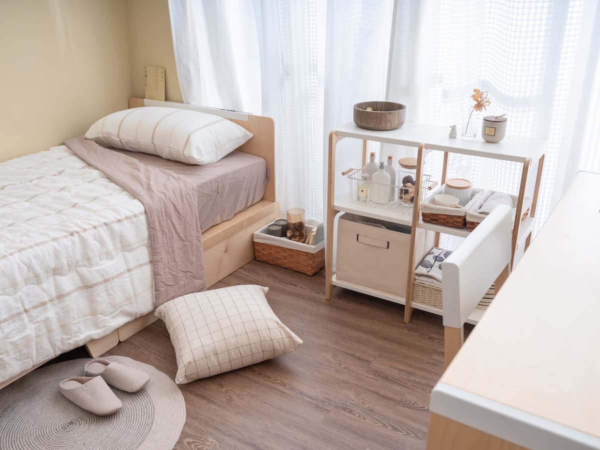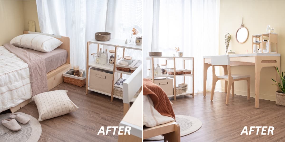 完成油漆與地板後,基本上我們已經完成空間的打底,再來就是加上家具與軟裝來點綴,打造出帶有日系質感的溫馨小套房。