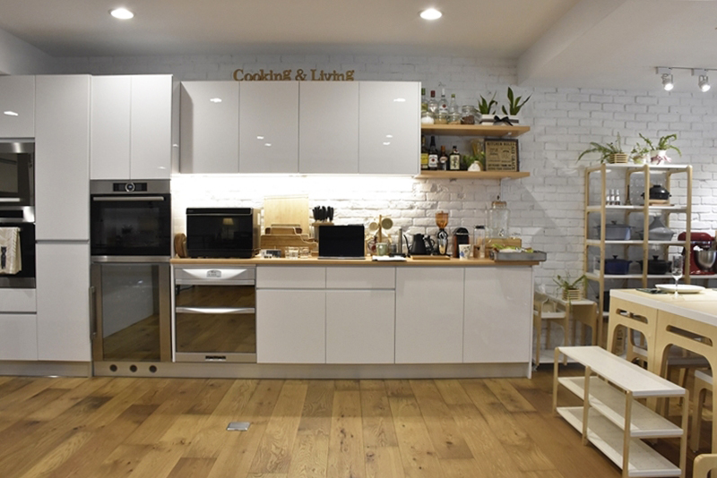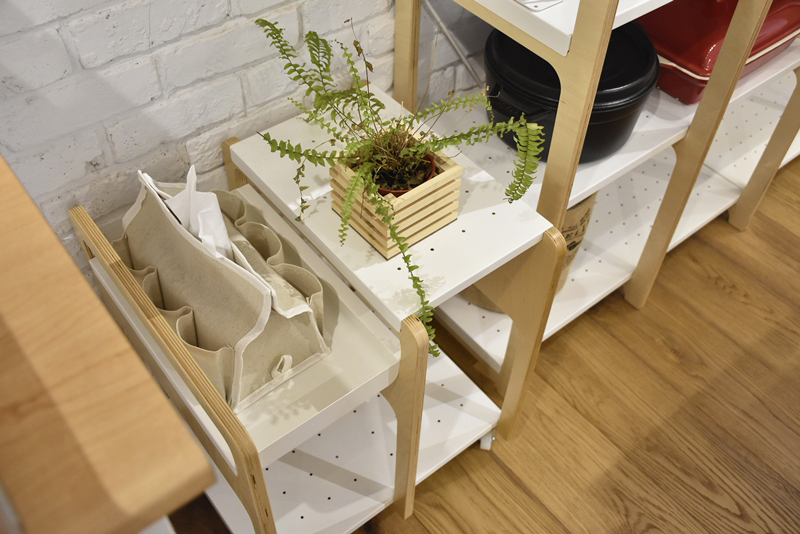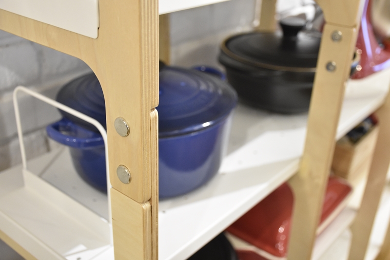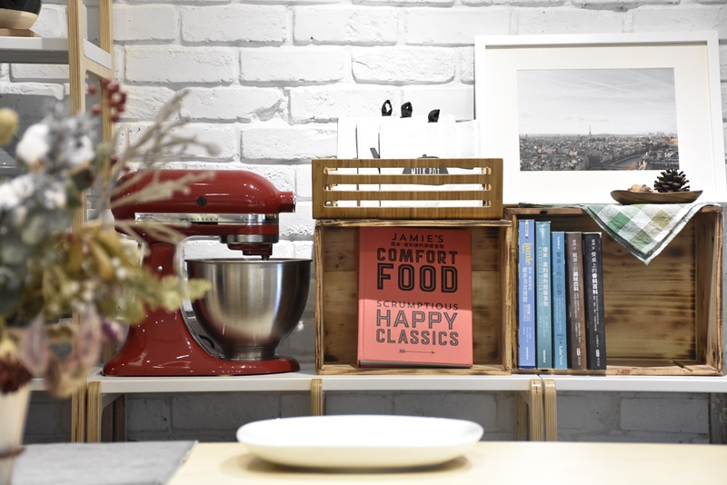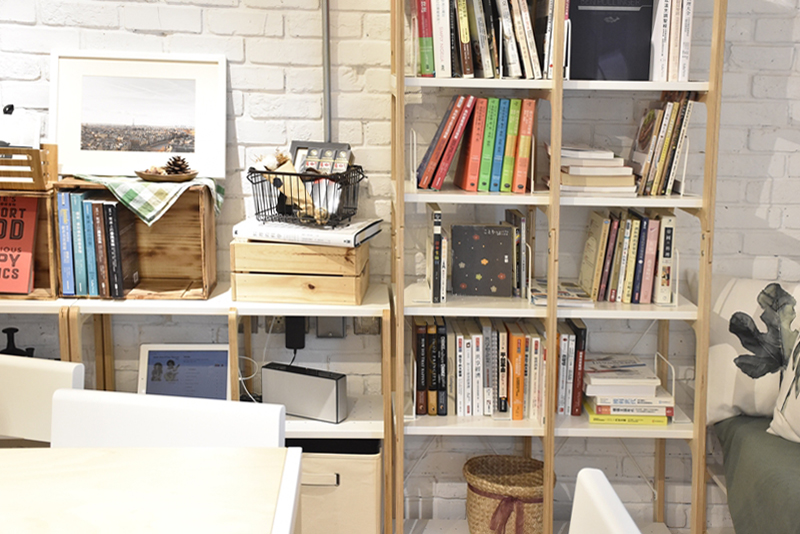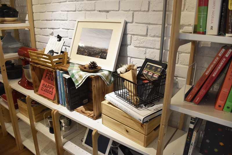 此區還放置著置物架、高架、書擋等走走單品,架上分別陳列著一本本與食物相關的書籍,與各式風格迥異的餐廚用品。