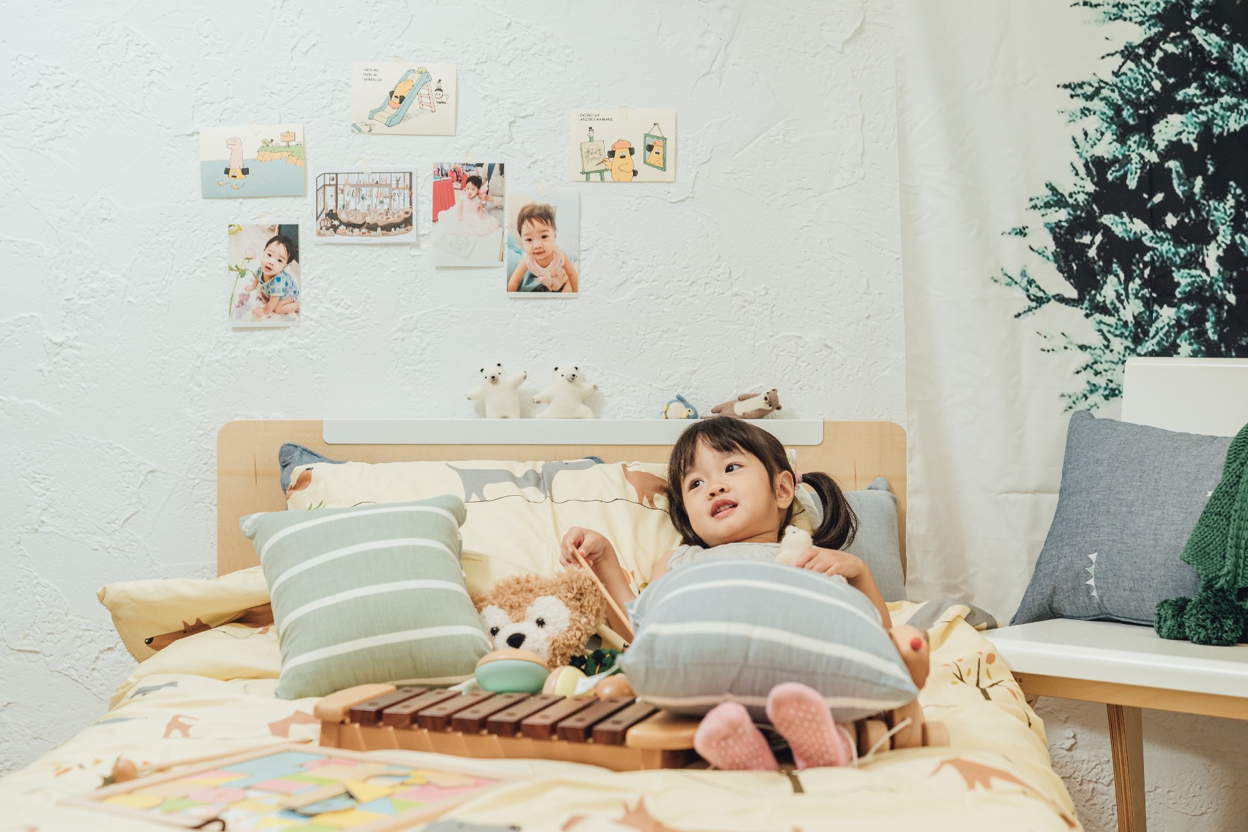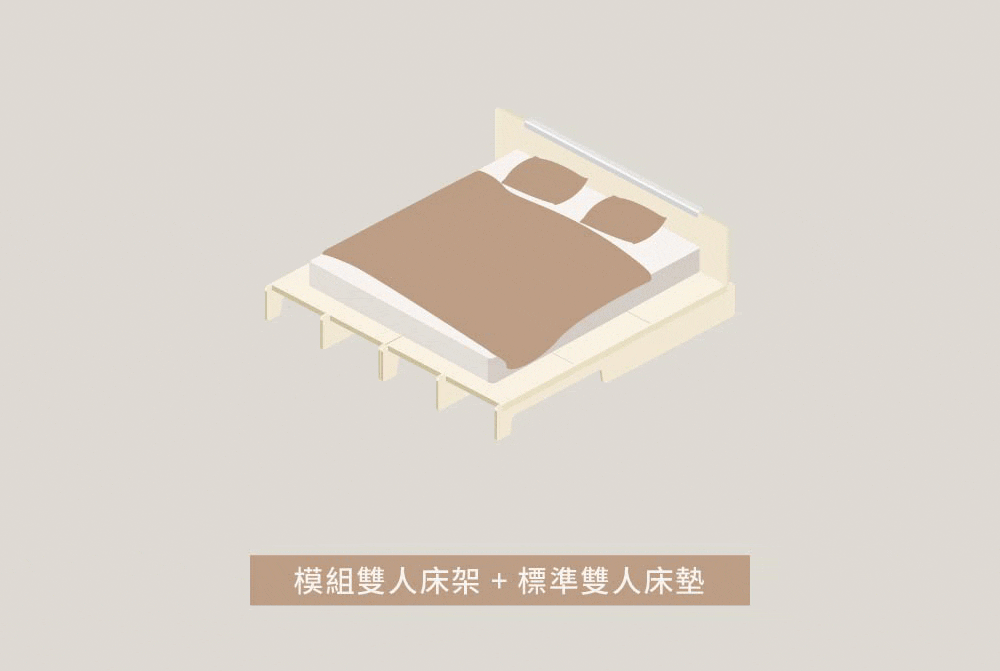 ▲ 使用 [走走模組床架],低甲醛板材+大圓角設計+模組化概念,孩子小的時候可以睡單人床,長大後再買一組單人床架,即可一起合併成雙人床架。