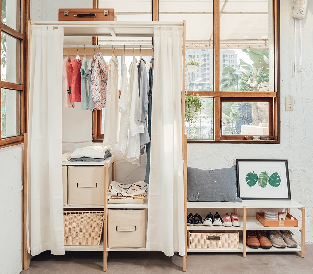 因此,兒童房最推薦的收納選擇就是「開放式收納櫃」,例如下圖的開放式衣架、開放式層架可以靠牆使用,也可以同時從兩邊取用非常方便。更重要的是開放式設計不像櫃子門可能會讓孩子夾到手,甚至有放大小坪數的視覺果效果,簡簡單單就能讓空間變得更開闊。