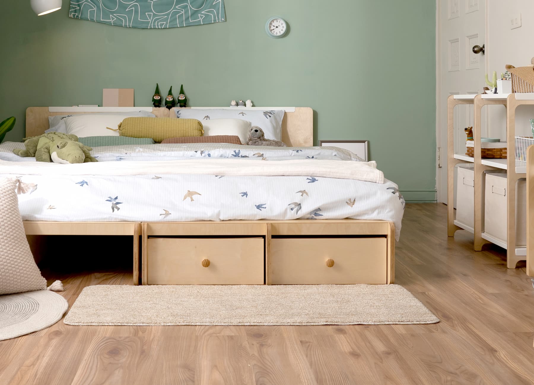 而走走床架模組化最大的優點就是能自由搭配組合,隨孩子不同使用情境轉換成單人床或雙人床,更替家長們破除孩子從高處摔下的疑慮。孩子小的時候可以睡單人床,長大後再買一組單人床架,即可一起合併成雙人床架;又或是家裡有兩個小孩,一開始先一起睡雙人床,長大一點想要分房獨立睡時,再把雙人床架分開,就是兩張單人床了,你說這是不是非常貼心又方便的設計?