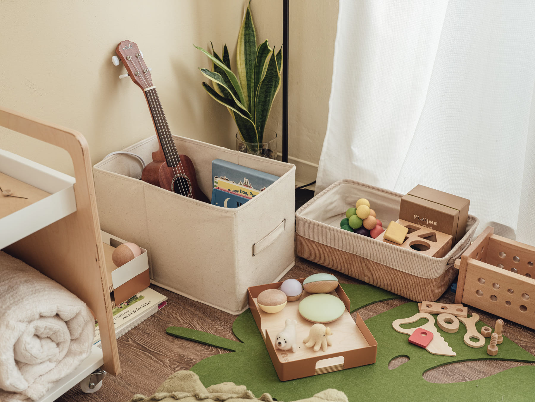 ▲ 讓孩子練習玩完玩具後主動歸位進布籃,重量輕、大小適中的布籃能讓收納的困難度降低,進而培養孩子主動收拾的習慣。還可增添 PlayMe Toys 安全又益智的實木玩具,用最溫和的方式讓孩子變聰明。