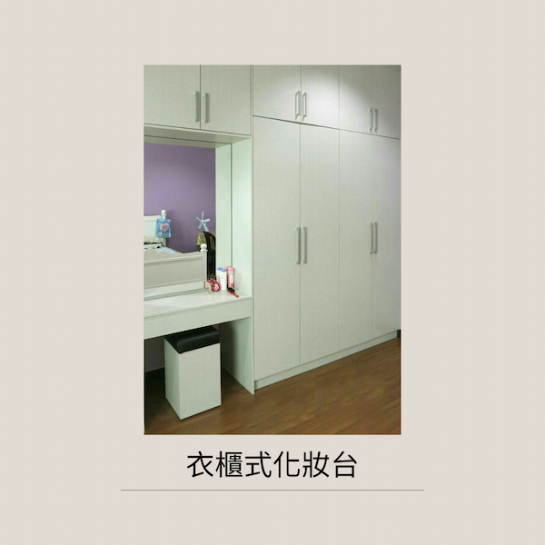 優點:和衣櫃一體成型有效利用房間坪數,節省空間維持順暢的動線,也能根據自己的收納需求去訂製,像是要做幾個層板、要不要做拉門把化妝台隱藏起來。