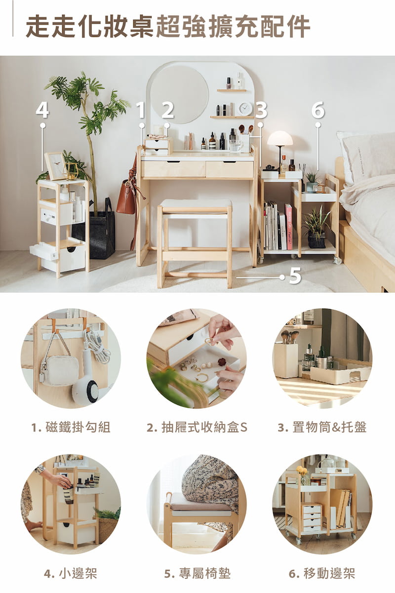 缺點:可能有些人的第一印象會覺得價格較難入手,但是因走走化妝桌是以實木等級的樺木夾板,加上台灣中鋼出產的冷軋鋼板製成,所以在品質上較為耐用,若以使用年限算起,其實價格並不比便宜的化妝台還貴唷~