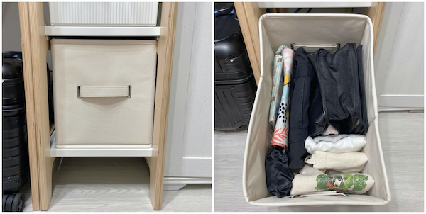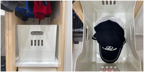 特地在衣物下預留位子給冬季的長大衣、風衣。現在則先放上無蓋收納籃,可以把形狀立體的夏季帽子收在裡面。我的帽子不多,沒辦法呈現「數大便是美」的感覺,所以決定不擺出來,而冬天的帽子通常比較軟,到時候就會把這個籃子撤掉,並把帽子收在木盒內。