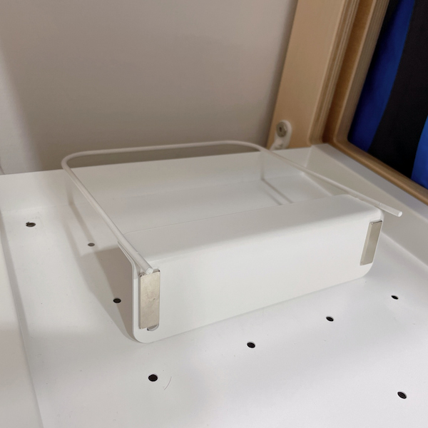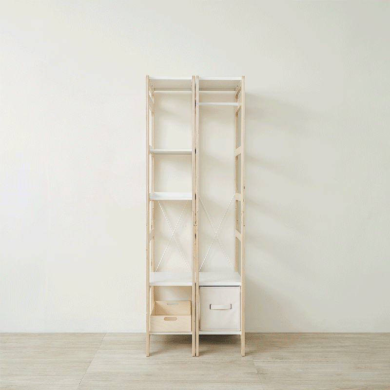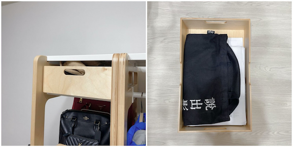 有兩種形狀,全平面跟有小圍欄的。因為木盒前後都有把手,如果你的模組衣帽包架沒有靠牆擺放(想要當屏風使用),前者搭配木盒可以前後都拉開抽屜,後者則比較不怕把抽屜推掉。連這麼細節的模組都設想到了,走走家具的使用者體驗設計真的很細緻。
