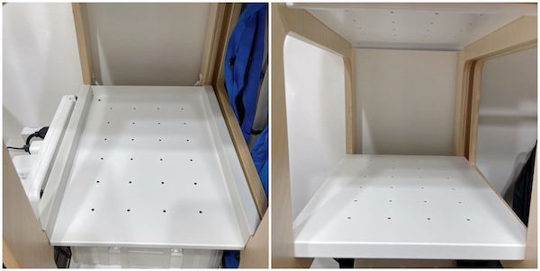 ▲ 左圖是有小圍欄的層板,就不怕把抽屜推掉;右圖是全平面的層板,放上抽屜前後都可以順暢拉開。