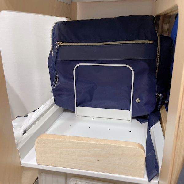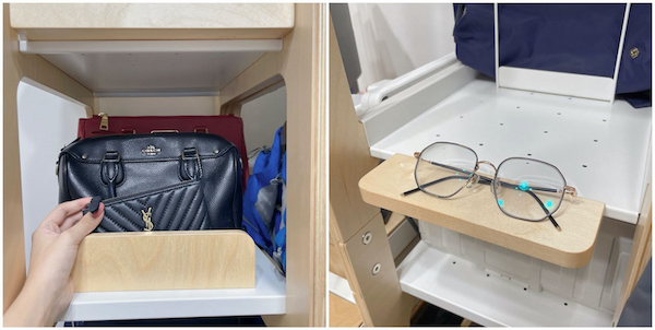 高架的好朋友書擋,在這邊搖身一變,成為將包包固定整齊的好工具。剛好可以卡在層板上的小洞洞,下面搭配強力磁鐵,看似輕巧的小鐵架其實很穩固。