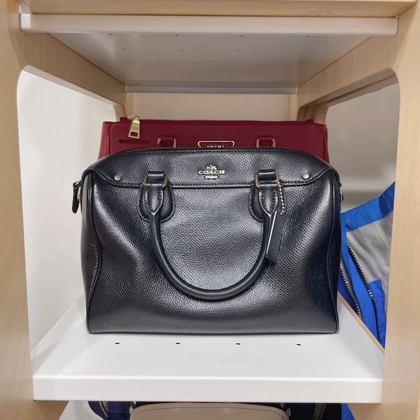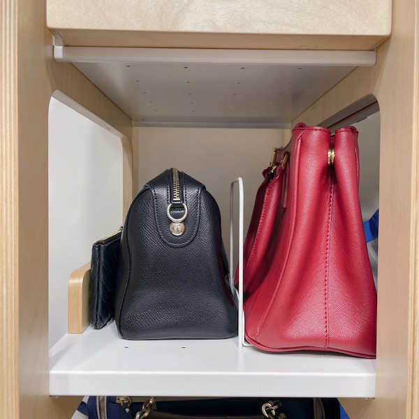 硬挺的包款固然能直接收在層板上,但有了書擋輔助,更有「一個位子,一樣物品」的歸屬感,而且不怕取用時讓整層包包都移位,是個看似不起眼,但卻非常重要的收納用品。
