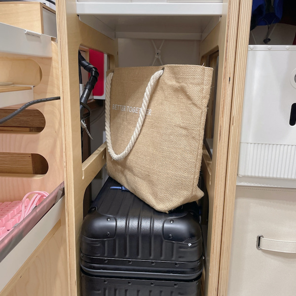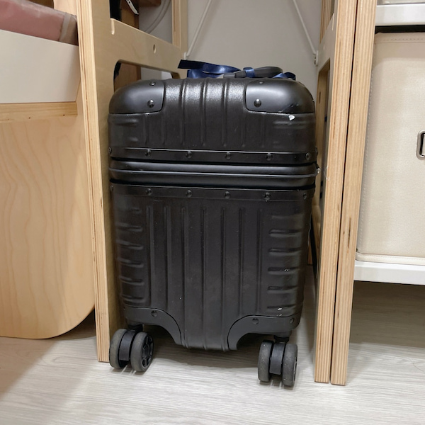 因為行李箱跟架子的寬度非常剛好,所以我刻意把層板再提高一層,讓下方的寬度有點彈性。(前提是我左右兩邊都有家具支撐喔!)行李箱上方的空間,我用來放外出回來,還沒清空的包包。
