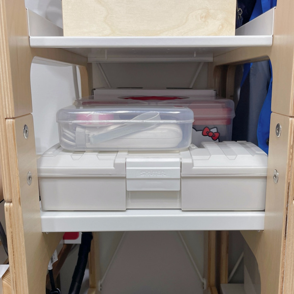 中間有點窄的這一層,則用各種收納箱裝我外出工作會用到的工具。