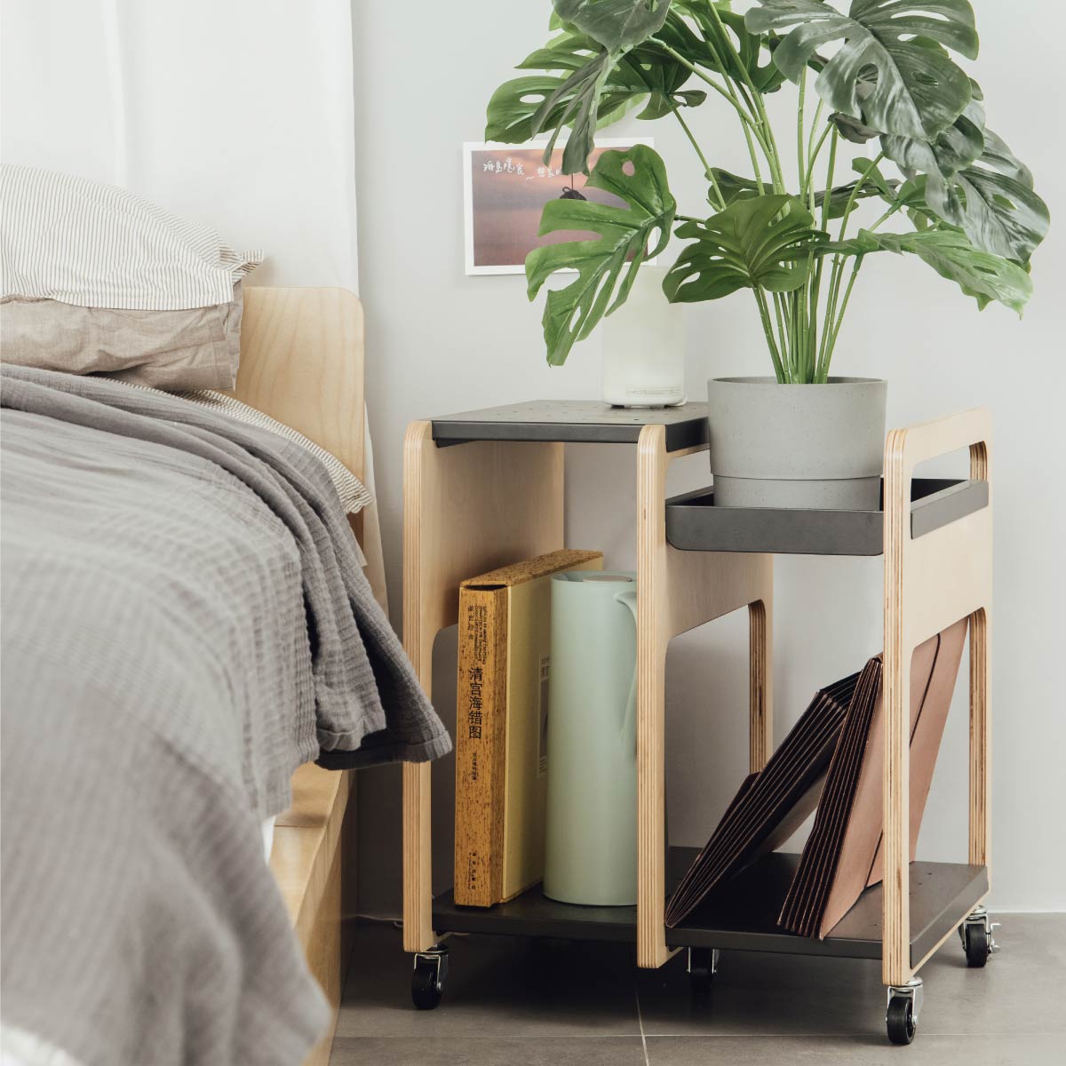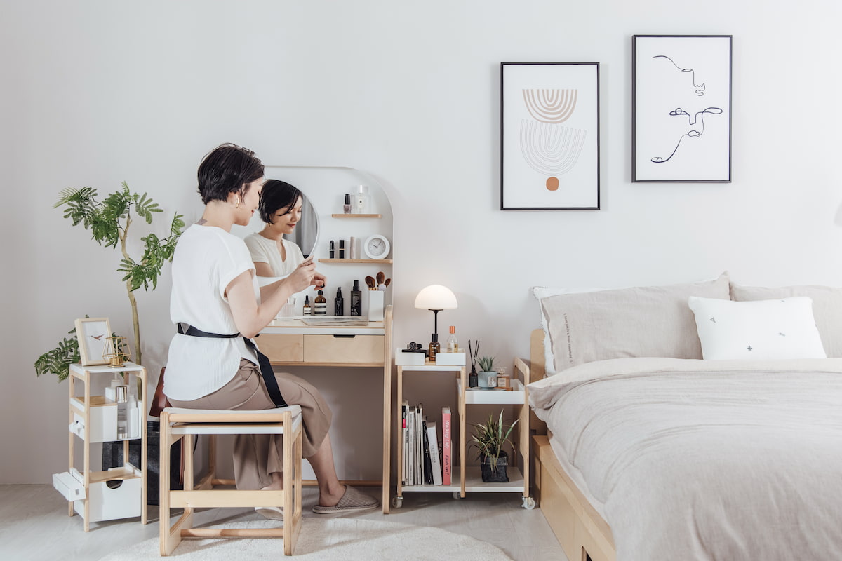 房間佈置Tips:擺放療癒單品、搭配單純的牆色,並將有意義、質感的物品以小型層架、托盤等擺飾於空間,具備個人的風格美感也同時達到收納效果