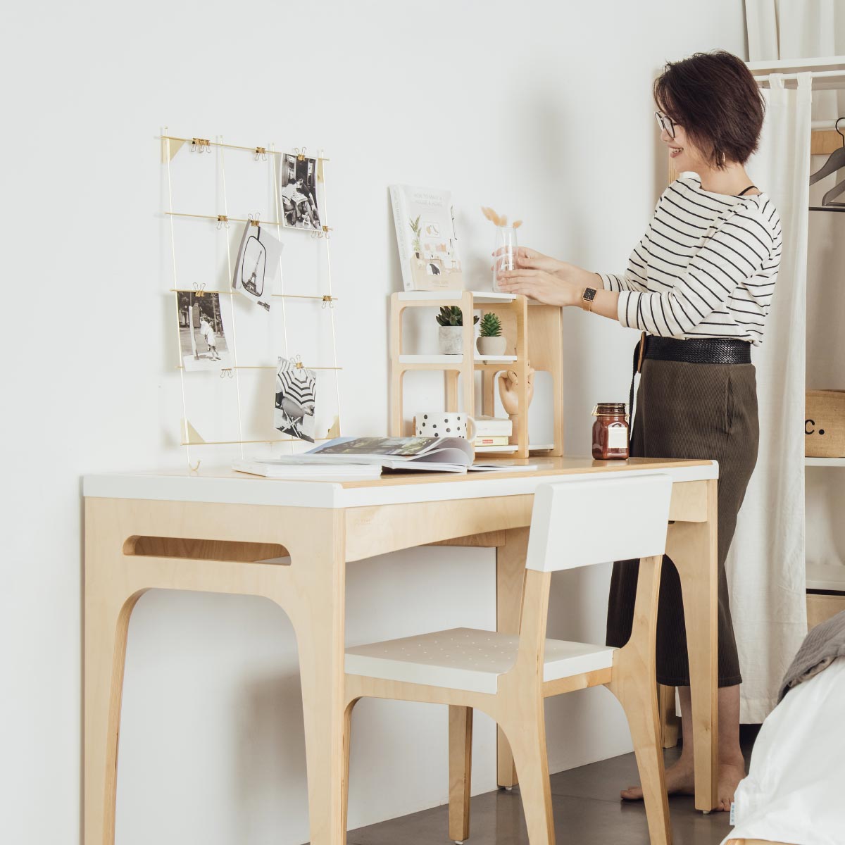 三、可以再添加一些對你來說,具有情感意義的小物,可能是照片、也可能是旅行中帶回的小物,而這類型的小物,很適合運用托盤或是小層架,放在你的書桌上,或是床邊櫃 ,就不會顯得凌亂。
