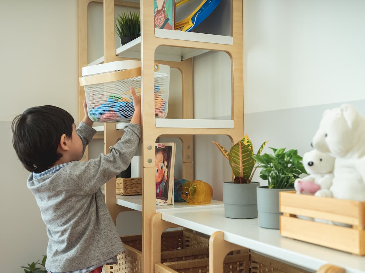 開放式收納能讓孩子一眼看清楚他能探索的物品,也能訓練孩子養成將物品收回原位的習慣。