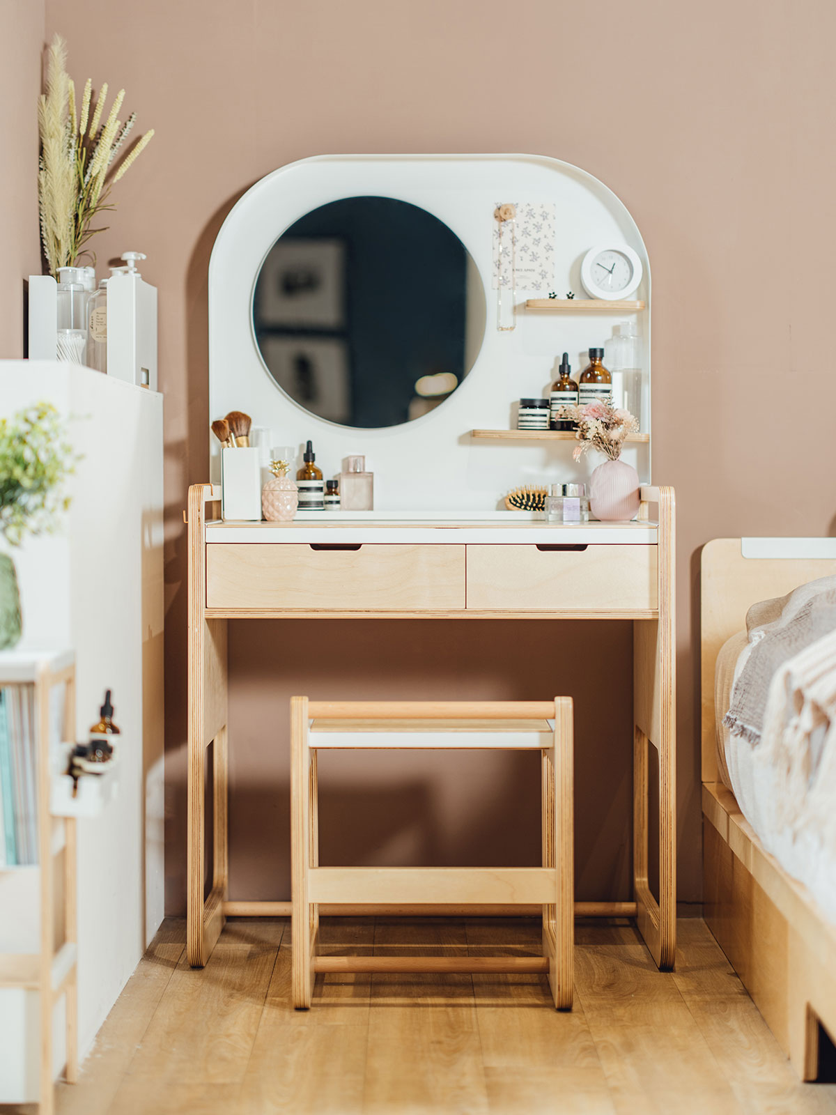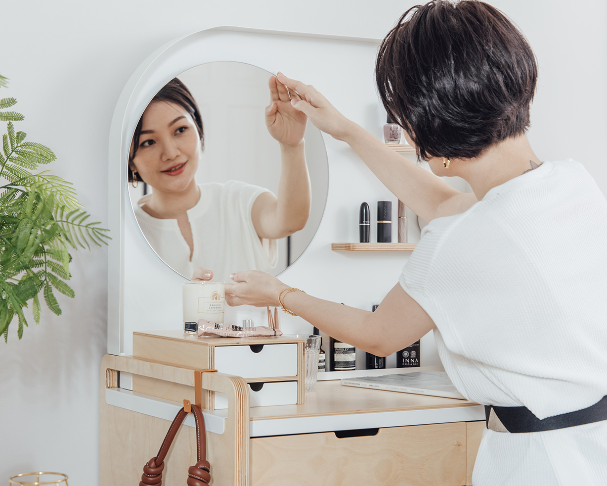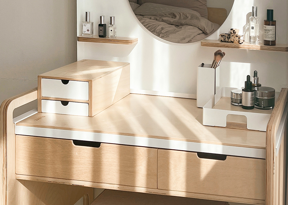 適時搭配收納盒與邊架,為化妝桌增添更多擴充功能