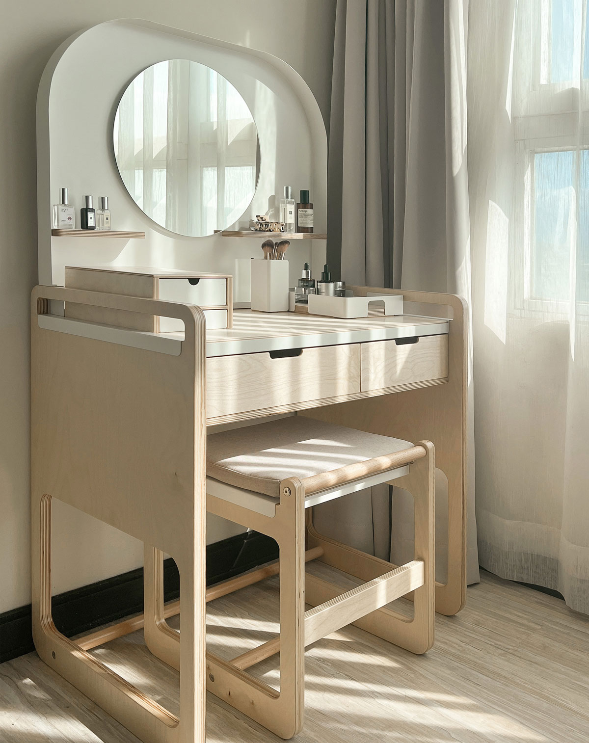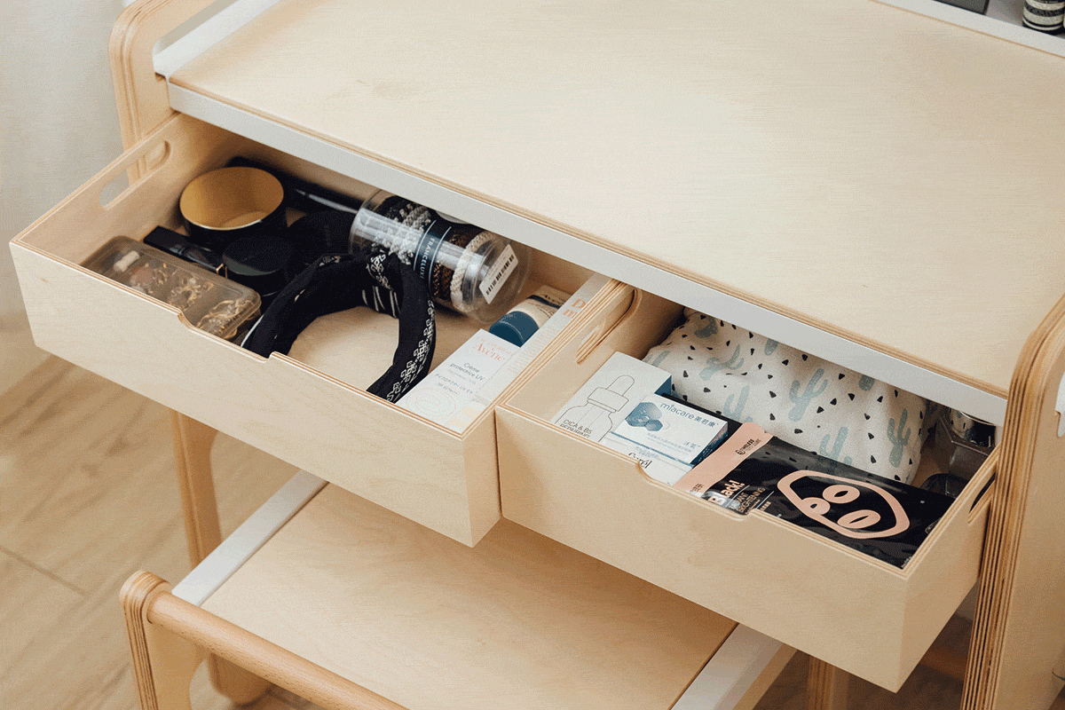 我們所設計的化妝台僅有兩格一大一小的抽屜,加上檯面上的長短木層架與展示直立式收納,其實這樣的收納功能,對於人們日常的保養與化妝是夠用的。比較常用的物品可以整齊地擺放在檯面上,而不常用的備品則放在抽屜中。