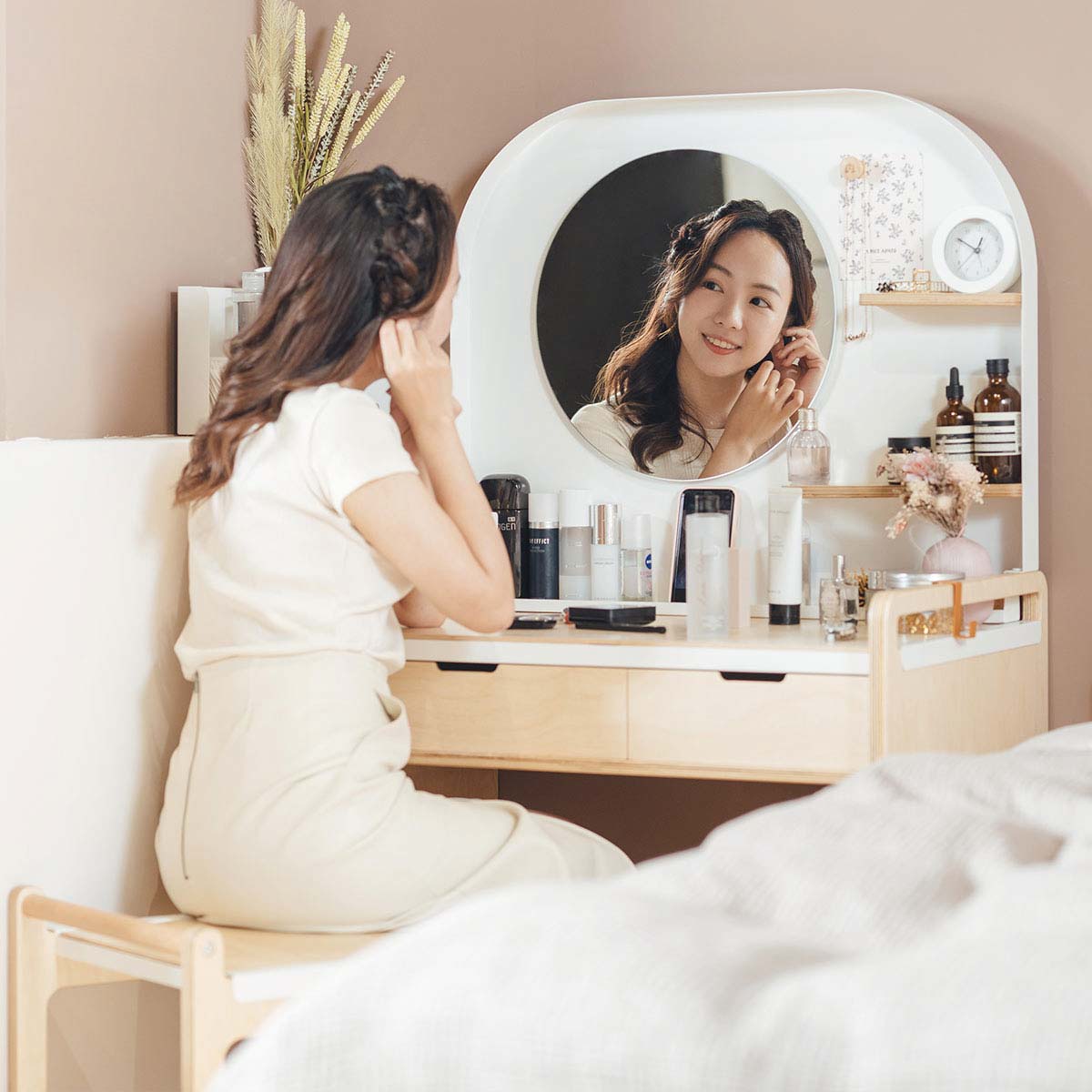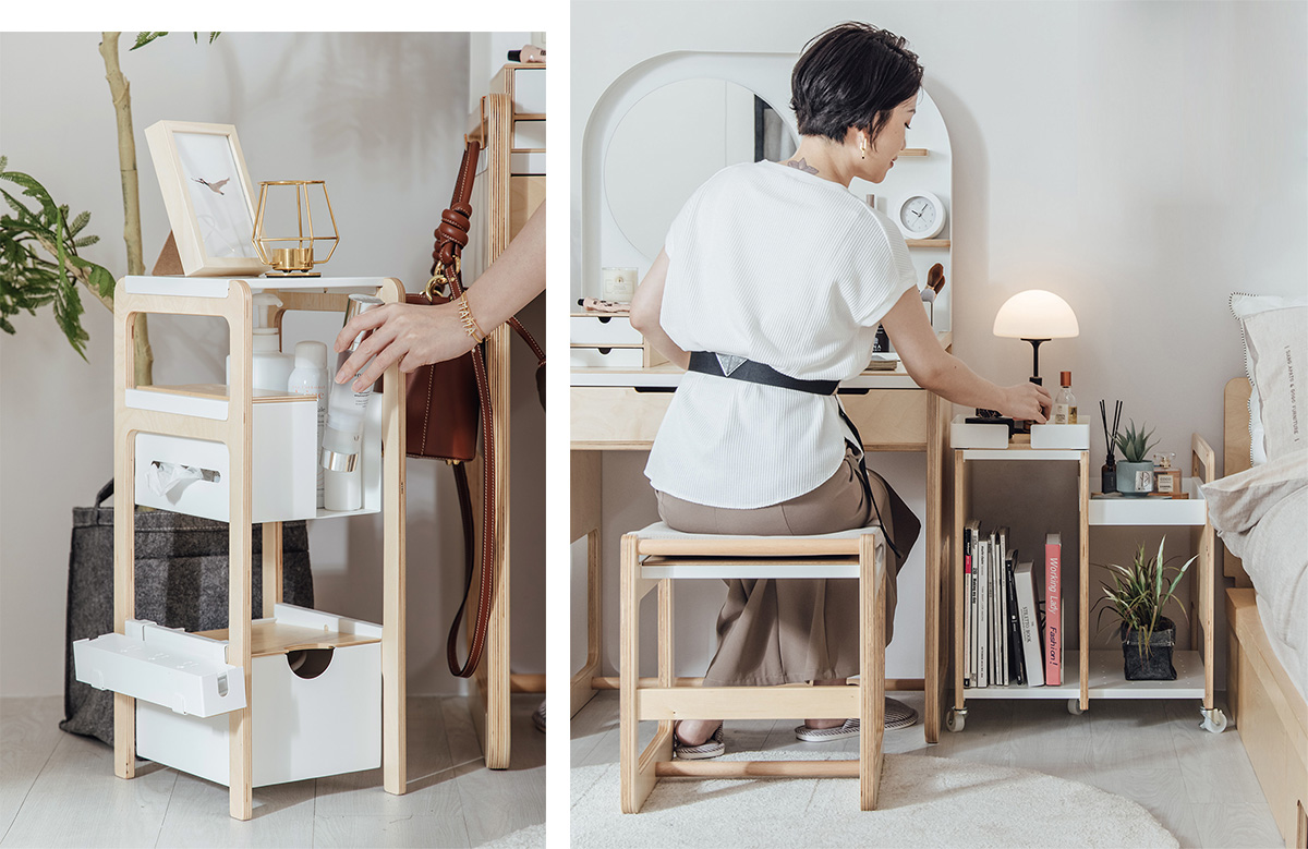 當初為什麼會設計化妝桌椅組呢?部分原因是在做消費者調查時,許願想要這個家具的占比頗高;加上化妝桌椅連同上方鏡面與下方櫃體,比起一般桌椅的體積更大,不僅占空間也非常不容易移動,更不用說搬家時有多困擾;另外,在台灣的市場上,化妝台的選擇並不多元,大多置入過多不必要的收納功能,櫃體的部份占比特高,風格單一較不易搭配。