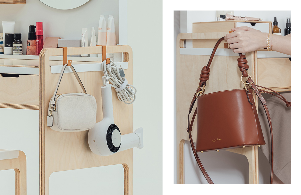 化妝台設計成開放式,搭配專屬的套件與配件,讓功能做更豐富的外部擴充,可放置吹風機、化妝包、外出包...等物品。[ 磁鐵掛勾組 ]