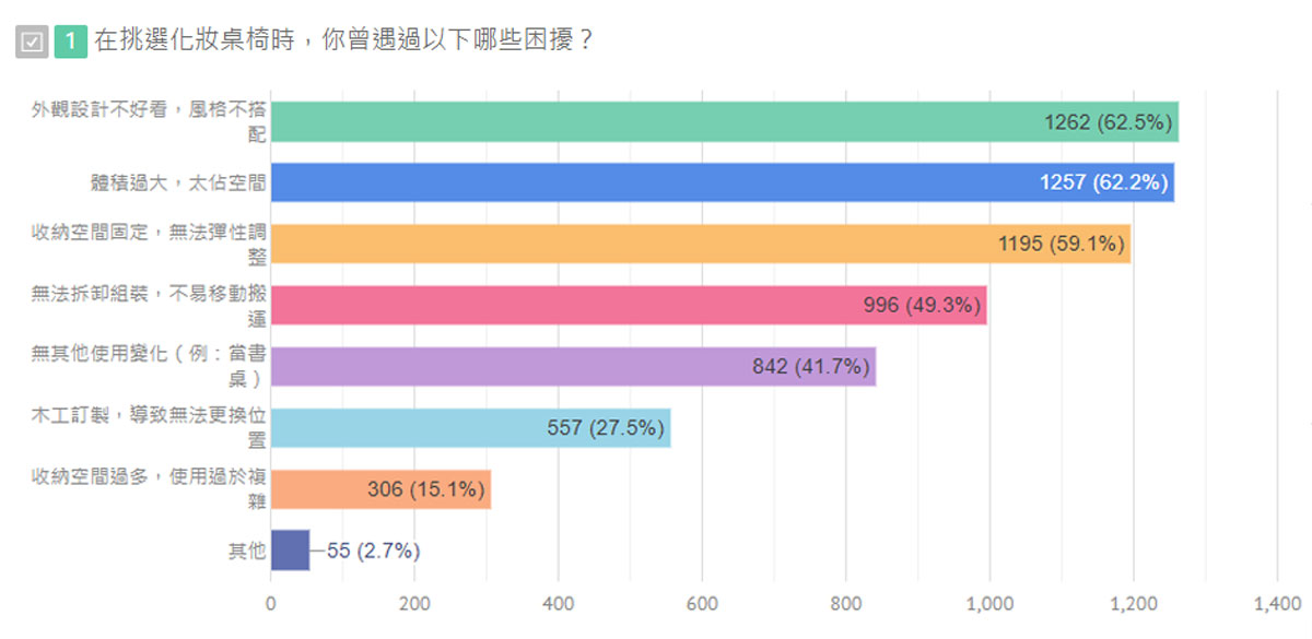 這次我們蒐集了超過 2,000 份問卷,針對所有女性對化妝桌的困擾,一一拆解分析,只為了打造最符合消費者需求的化妝桌。