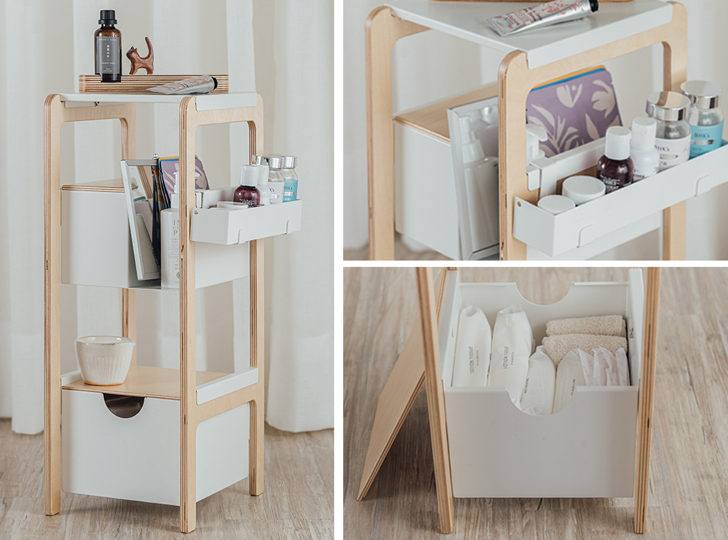 如果檯面上的收納還不夠用的話,化妝台的兩側則還可以考慮使用 [ 小邊架 ] [ 移動邊架 ],放較大型的備品如身體乳、衛生用品、衛生紙...等品項。