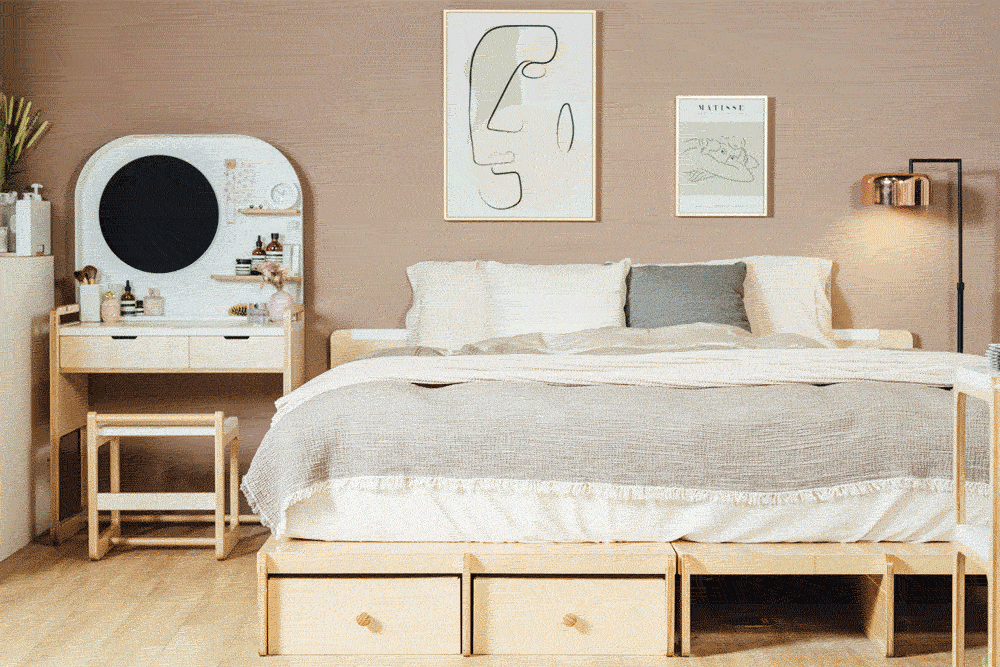 極簡的家具配置能夠讓空間看起來、住起來都更舒適;假設一張化妝台真的放不下多出來的私人物品,不妨此時再考慮添加其他品項做更完善的擴充。