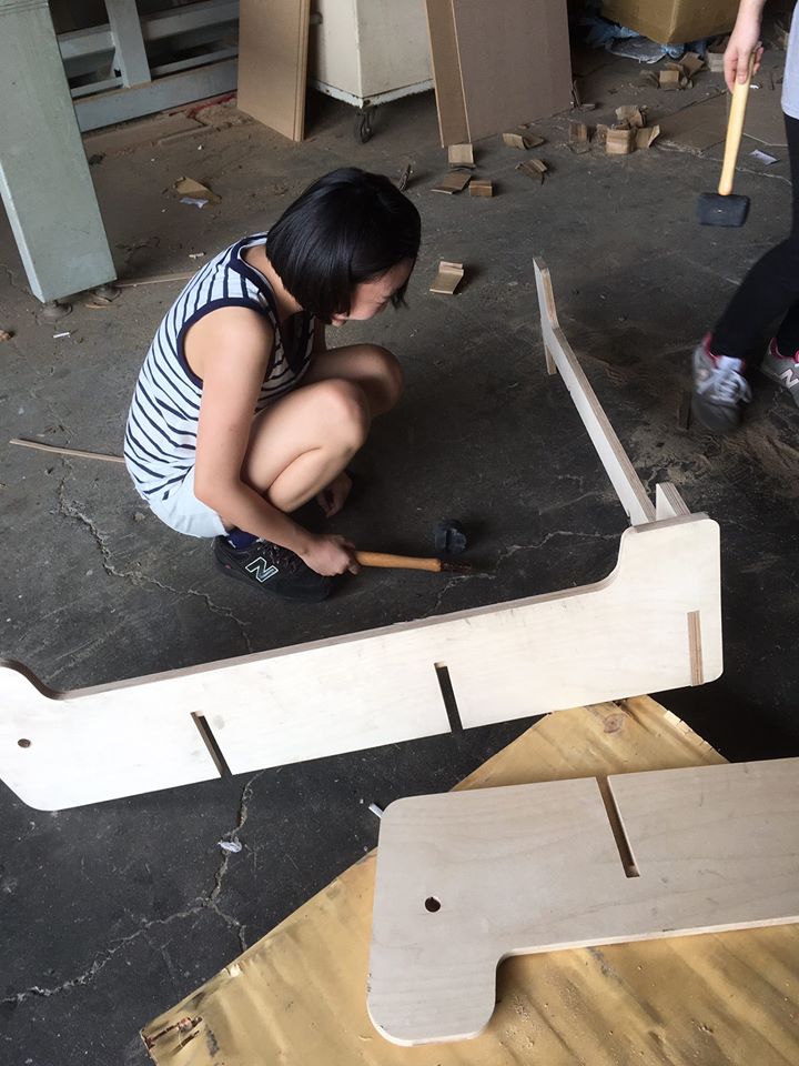最開始的時候會有點像無頭蒼蠅,不過我們三人還是盡力地分頭找資料、做了初步問卷調查、畫了一堆設計圖並內部討論好幾回,製作模擬3D圖的過程中不斷調整,設計慢慢收斂到比較接近現在粉絲專頁上看到的照片了。大約四月的時候,我們找了一間小工廠做木材的加工,然而其CNC的機具在製程上有一定的限制,而且也是我們第一次做這件事,一開始的樣品沒有所謂的產品R角、也沒有將公差抓得非常精準,當時的我們在工廠敲打著第一版的走走家具,還不小心用力太猛敲壞了一隻橡膠槌(註1:絕對不是V敲壞的。註2:由此可證我們使用的樺木夾板有多麼堅硬)。