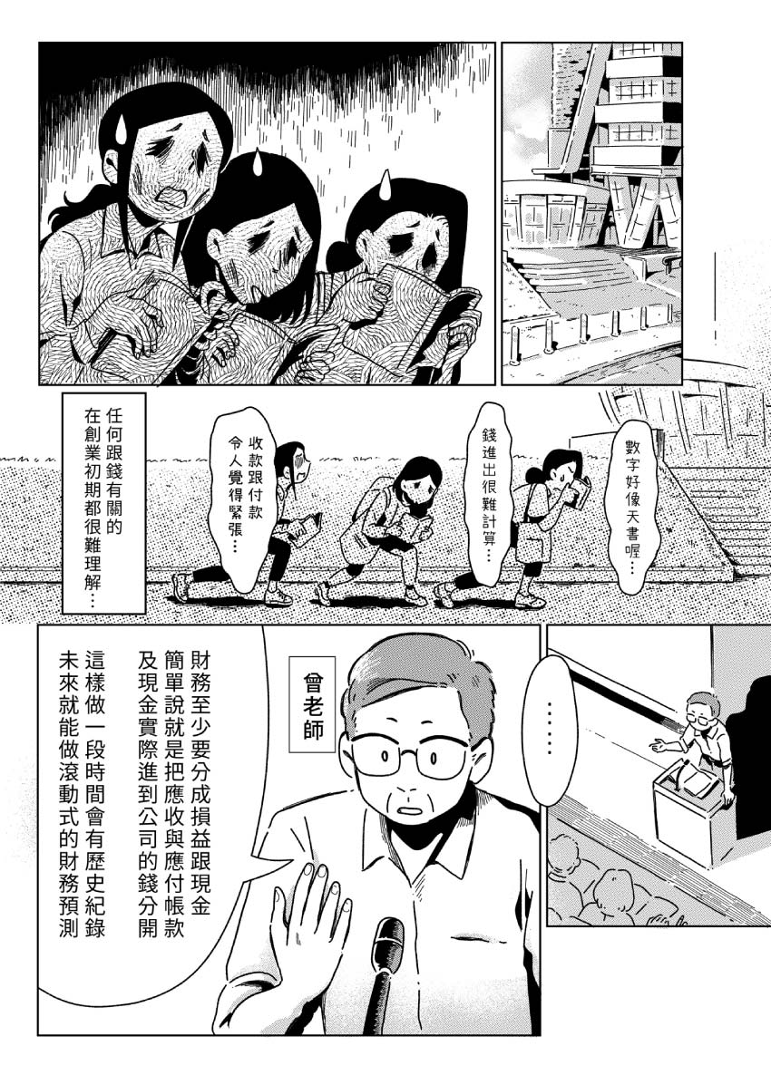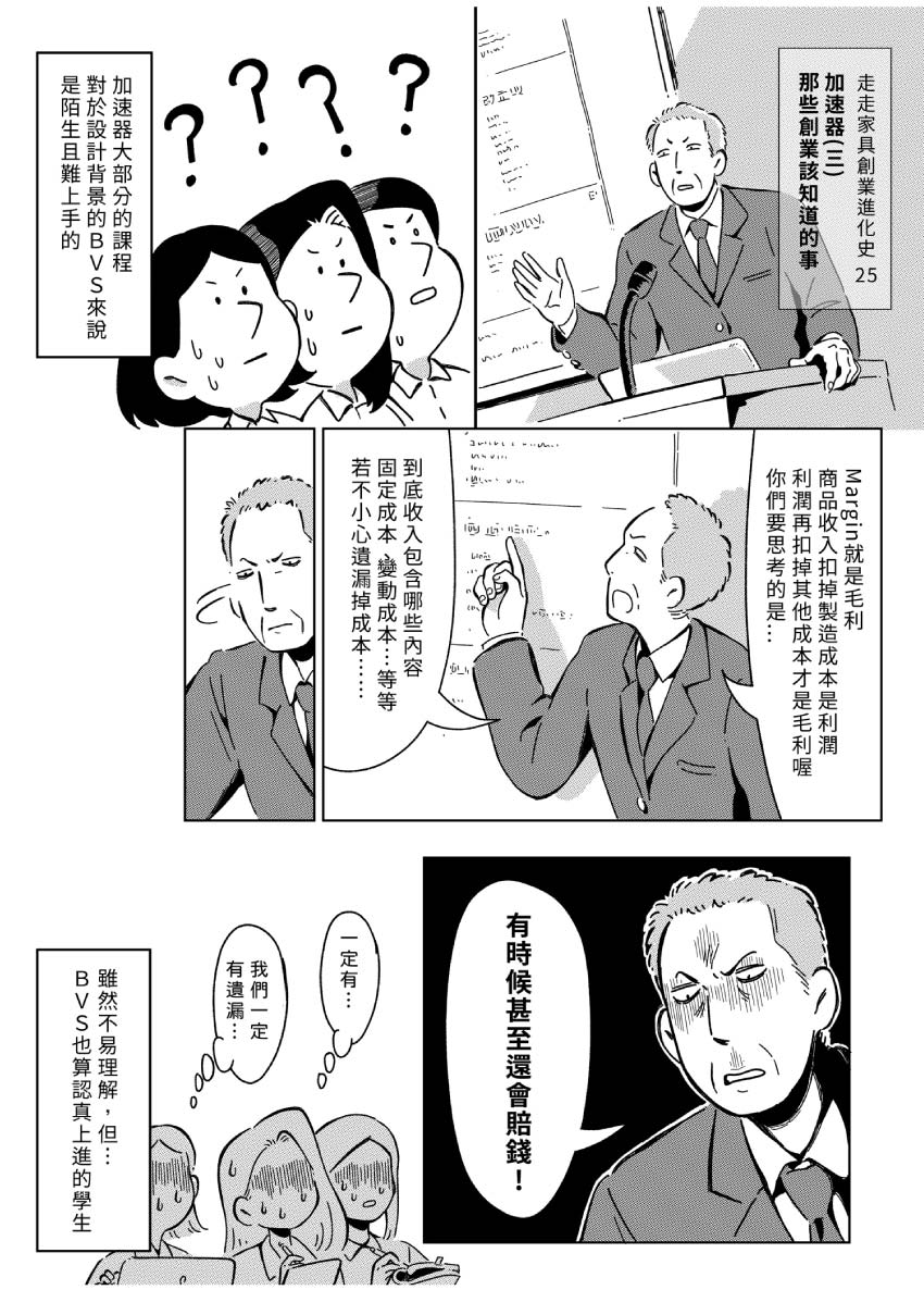 VOL.25 - 加速器(三)那些創業該知道的事 都是設計系出身的B.V.S.在加速器老師們的指導下,才終於學習到創業必備的基礎財務知識,並且開始進一步認識消費者輪廓...... 原作 / 走走家具 漫畫 / 貞尼鹹粥