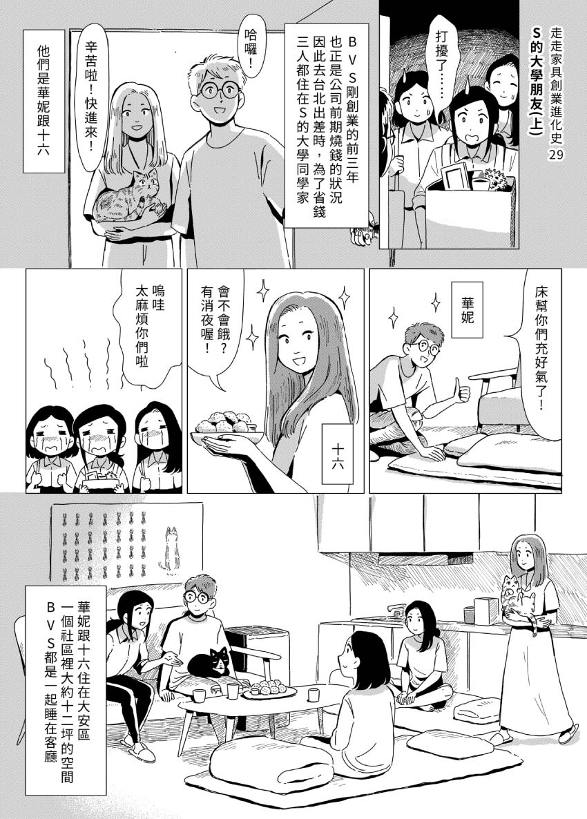 VOL.29 - S的大學朋友(上) 剛創業的B.V.S.過著幾乎沒有收入的日子,因此到台北出差時,總是需要接受朋友們的雪中送炭,三人才有一個可以遮風避雨的溫暖住所...... 原作 / 走走家具 漫畫 / 貞尼鹹粥