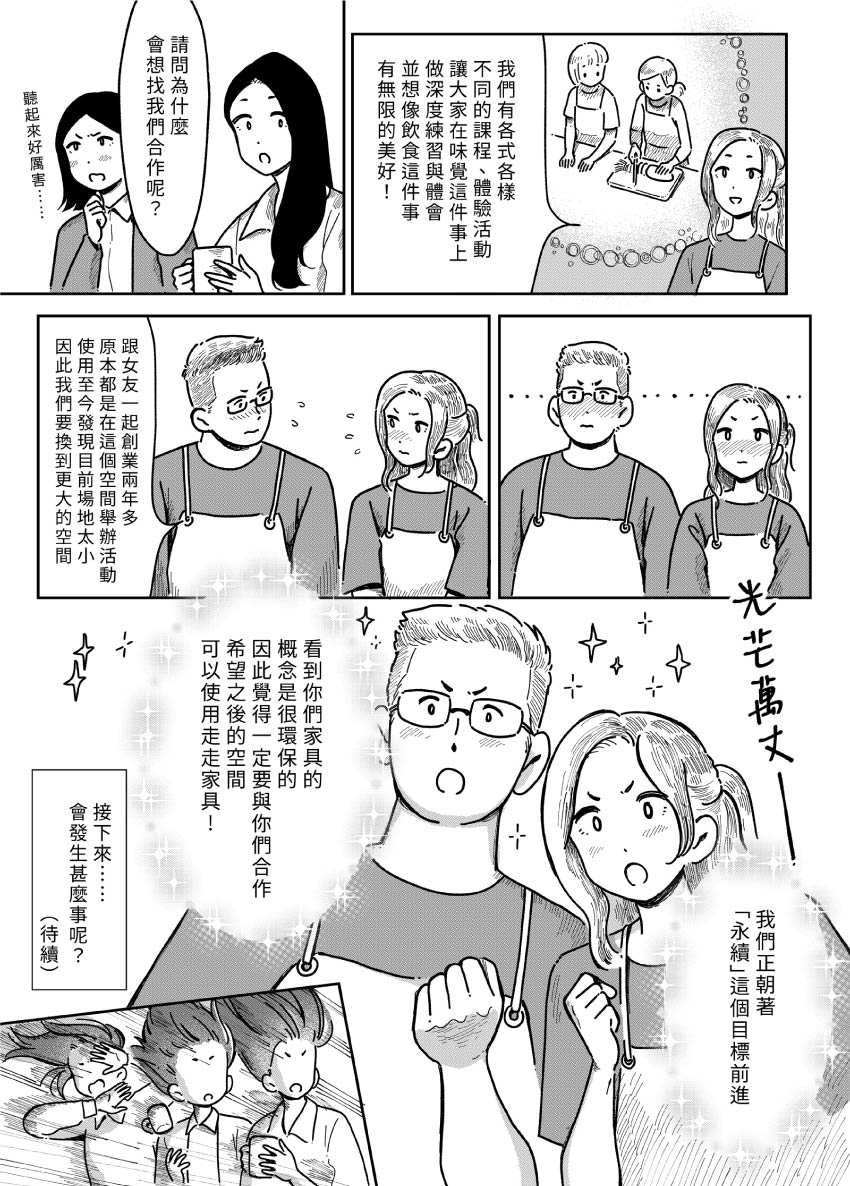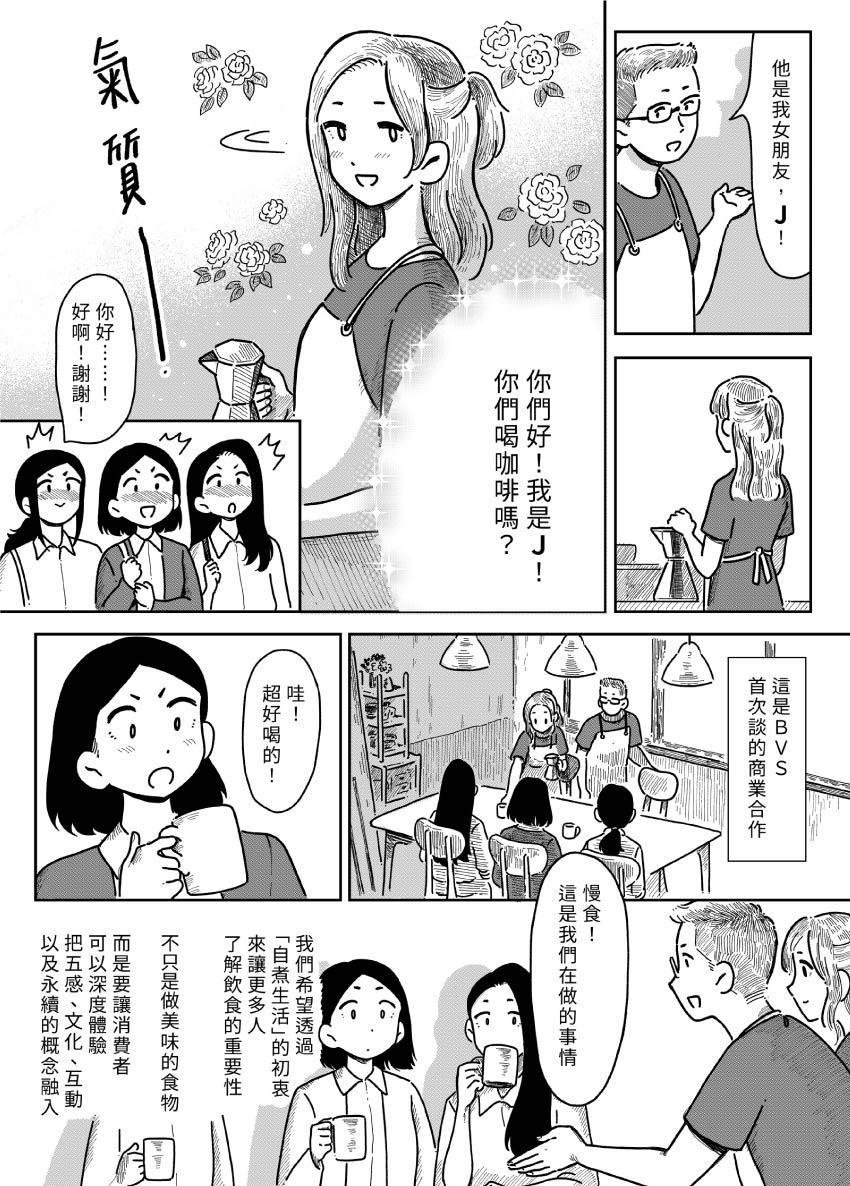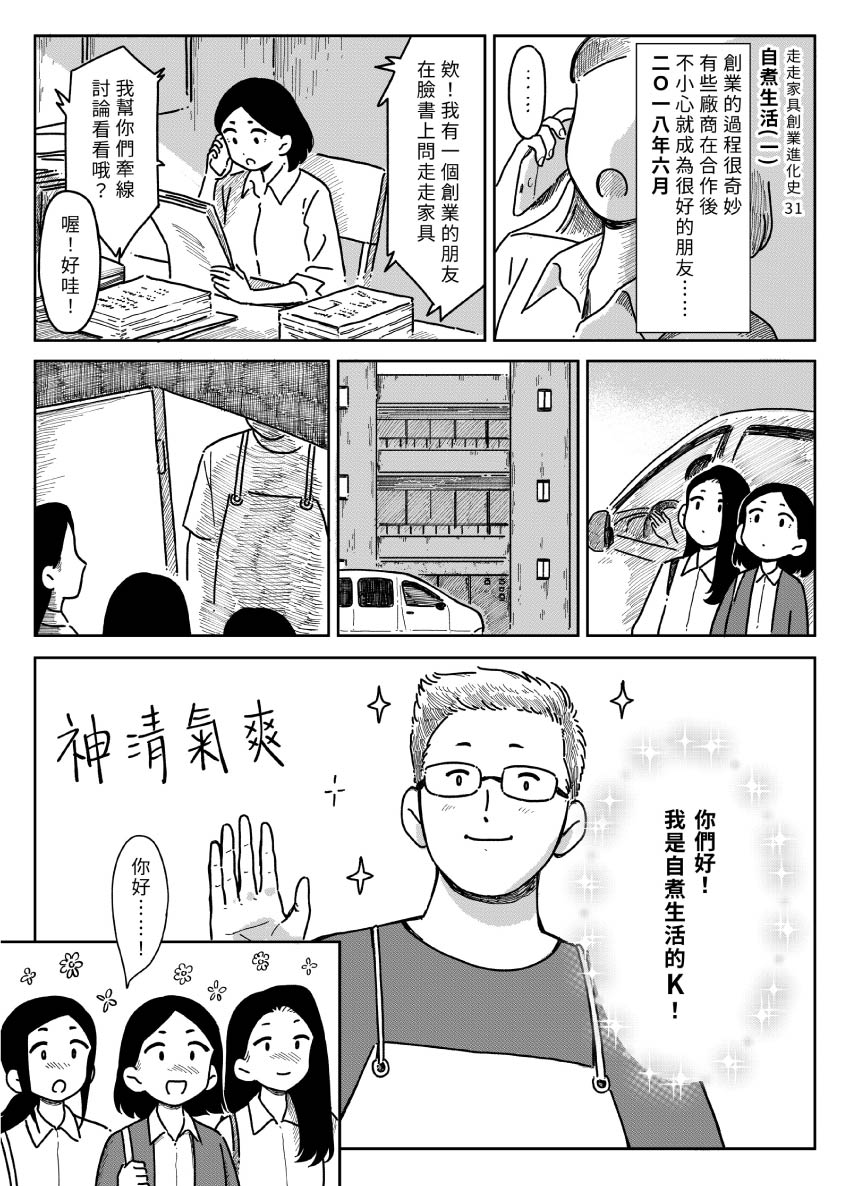 VOL.31 - 自煮生活(一) 在創業兩年後,B.V.S.迎來第一次商業合作的機會!對方是也正在創業、提倡慢食生活的氣質情侶,他們為什麼會想與走走家具合作呢?...... 原作 / 走走家具 漫畫 / 貞尼鹹粥 特別感謝 / 自煮生活 Cooking & Living