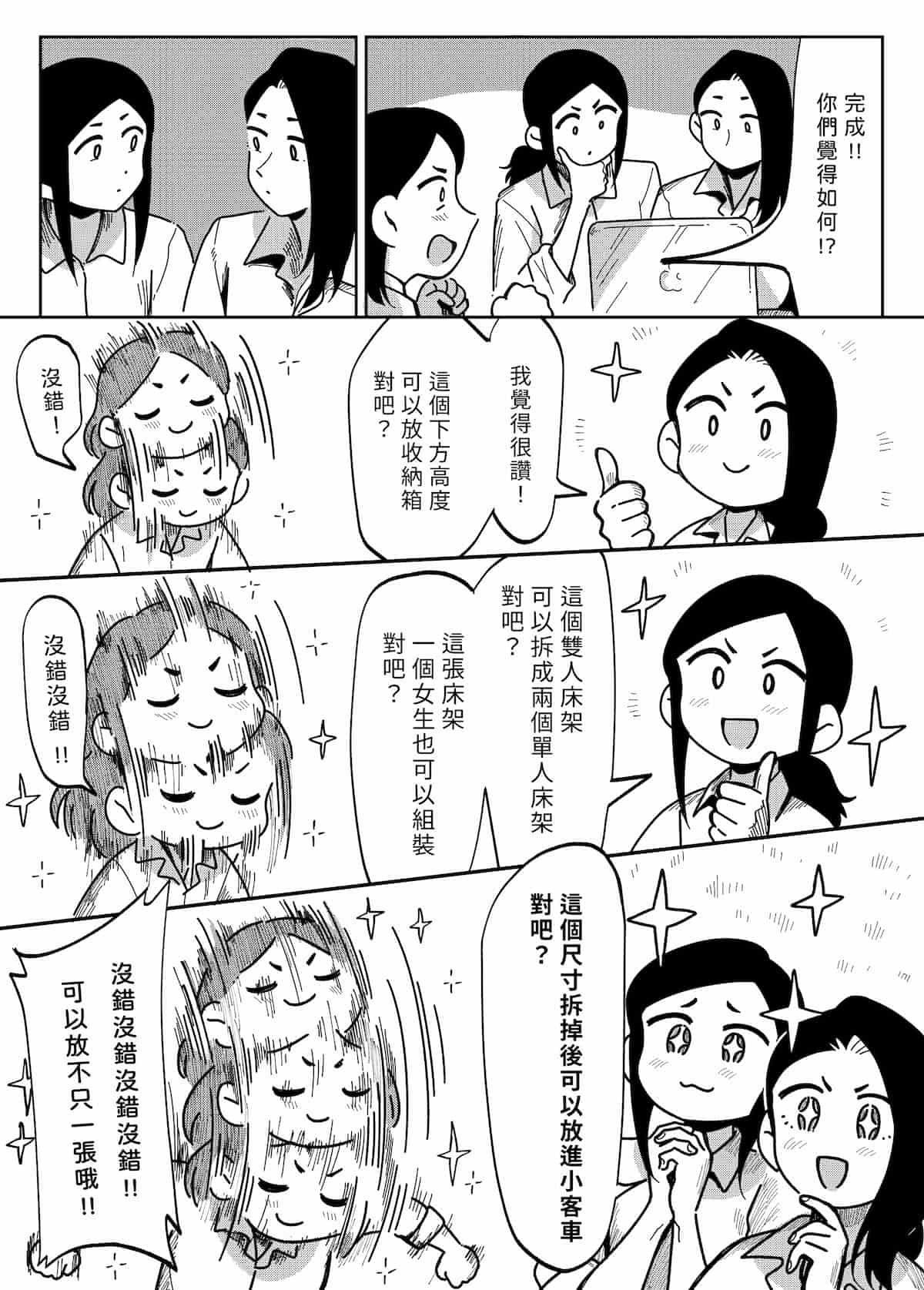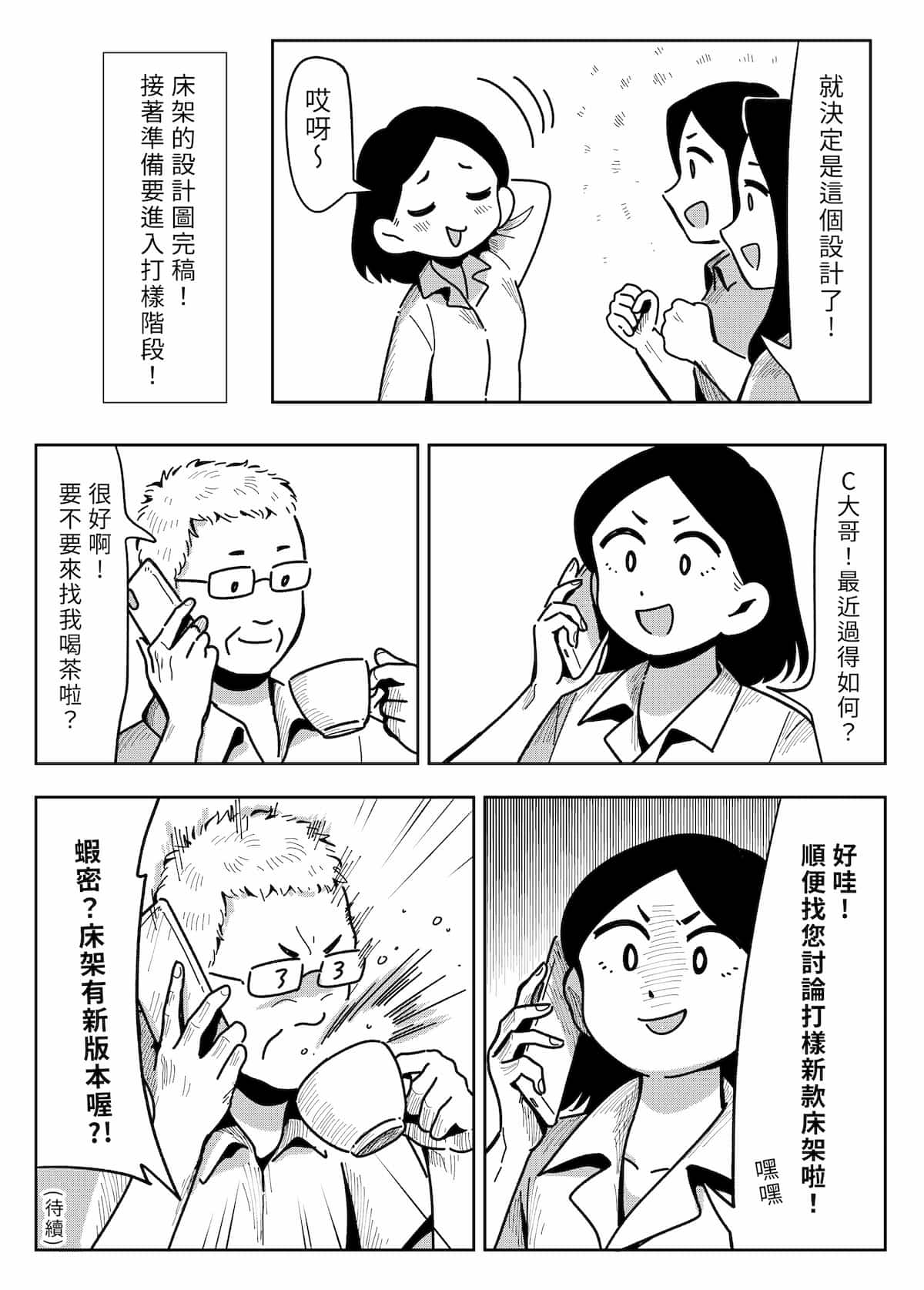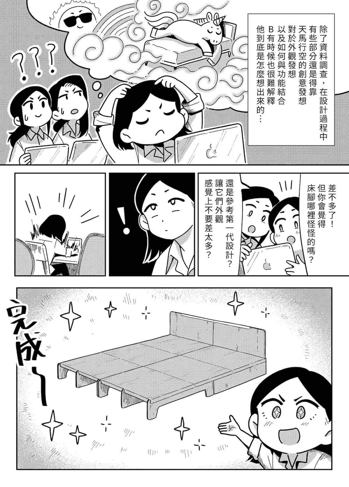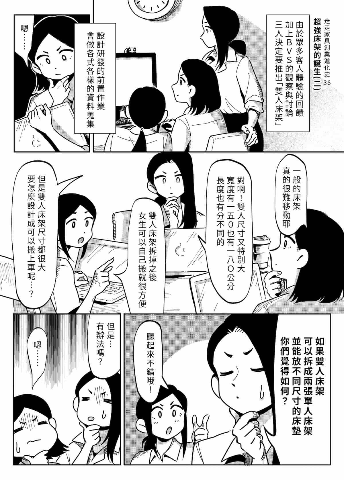 VOL.36 - 超強床架的誕生(二) B.V.S.決定推出雙人床架後,在研究與討論上下了不少功夫,終於設計出好拆裝、彈性變換,甚至能放入小客車等功能的夢幻雙人床,而下一階段即將準備......!? 原作 / 走走家具 漫畫 / 貞尼鹹粥