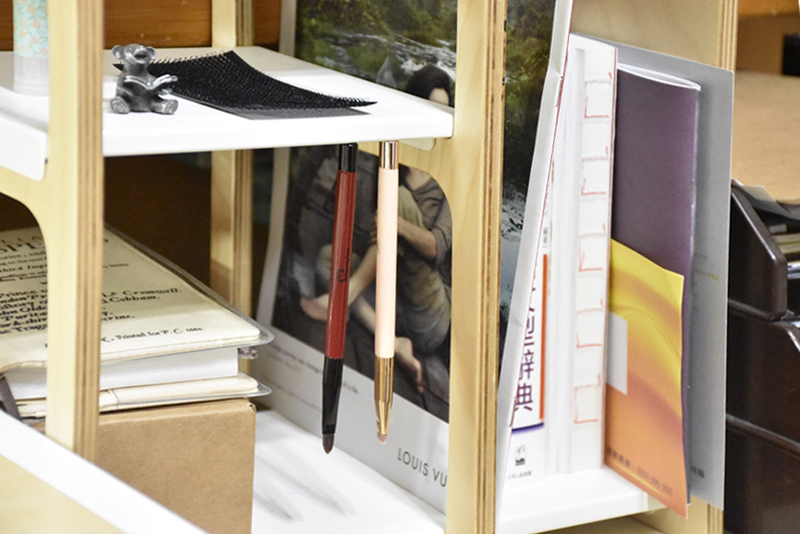 隨興一放,竟讓眉筆的磁力與桌上架相呼應,就連小薇的阿姨也曾被其吸引。意外且獨特的開展也為生活增添一筆充滿笑聲的回憶。