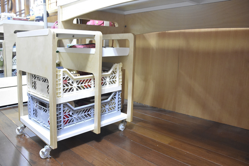 ▲走走的移動邊架設計附有推輪,方便移動,邊架下方也有極大的空間可放置物品,相當方便。