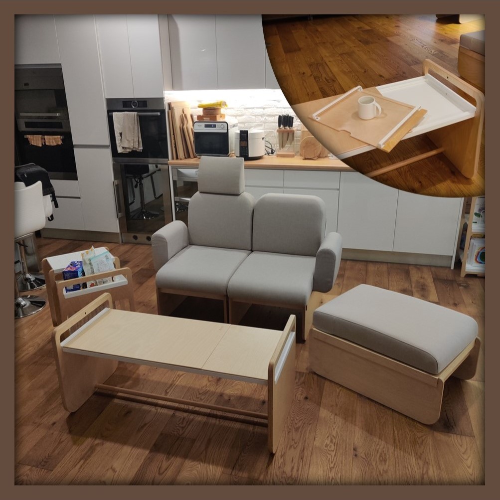 ▲ 客廳的體驗,走走的巧思在一些細節都很有趣,比方他們的茶几,桌面有一塊可以拿下來反著當托盤用,旁邊的大腳凳可以跟沙發組成貴妃座,或者是搭配變成L型沙發唷~