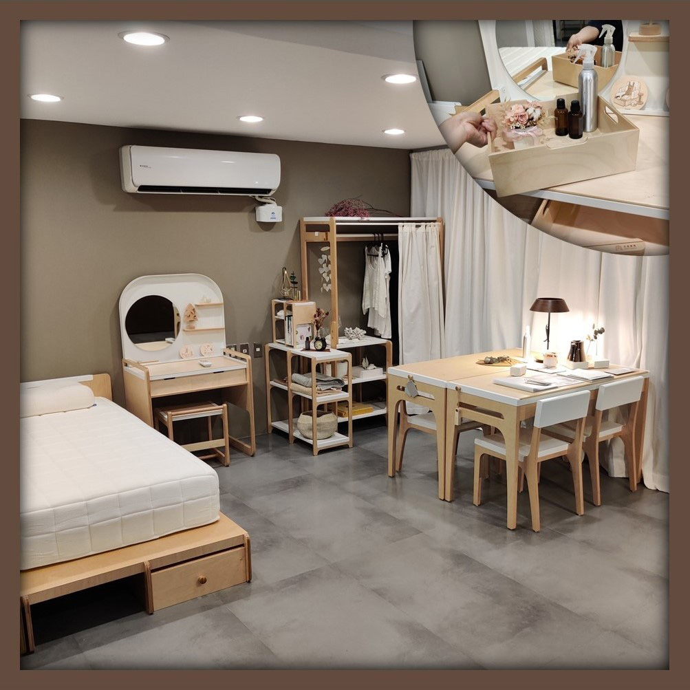 ▲ 居家的擺設空間體驗,我最愛的就是右邊那組桌椅,但他們梳妝台也有一個很懂女生的巧思,右上角照片是可以方便整個抽出來的化妝台抽屜,我最討厭保養品化妝品亂成一團,但一般滑軌抽屜只要隨便找個什麼就會亂掉,這個設計超好整理,而且如果你要帶到浴室保養什麼的也可以一拎就走