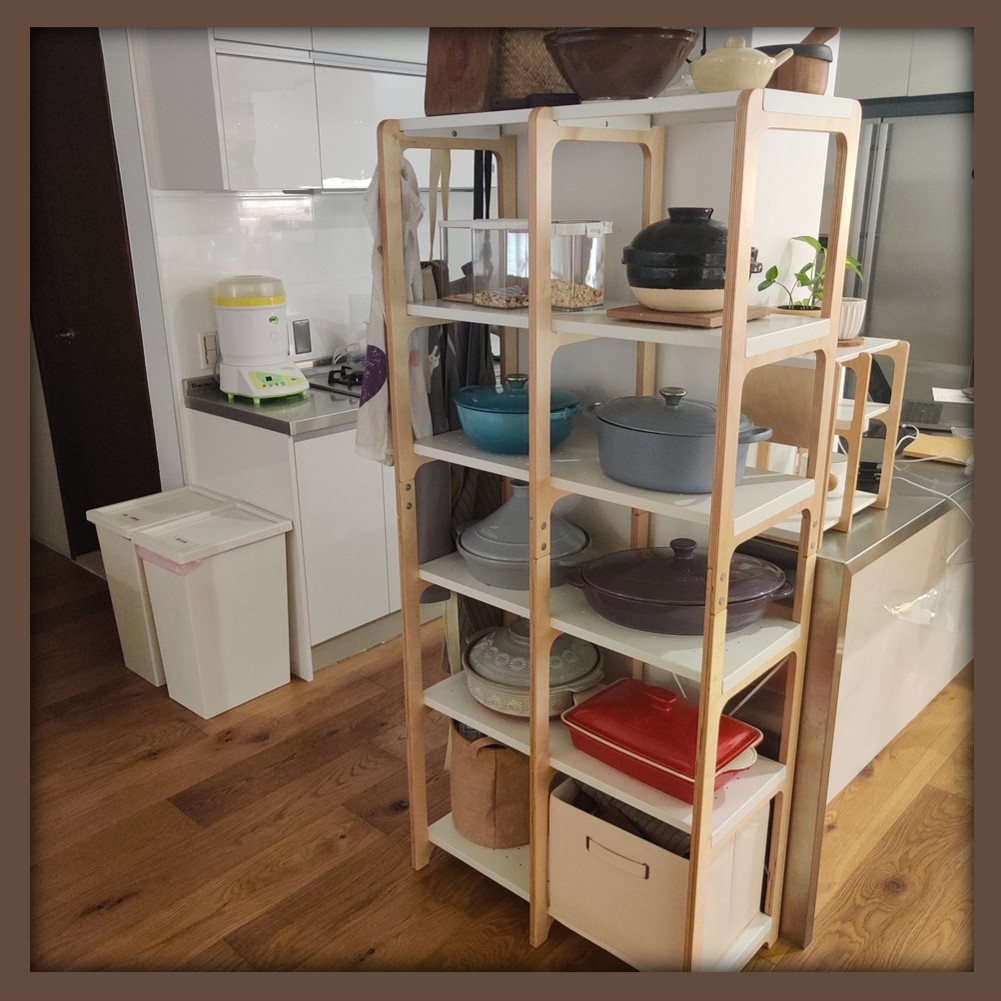 ▲ 我覺得很猛的層架,後來我發現我數錯了,加上最頂層的陶盆,這個架子一共放了八個重型廚具,有用過鑄鐵鍋的人就知道這有多驚人,我相信就算它全部裝滿書也不會有絲毫動搖的
