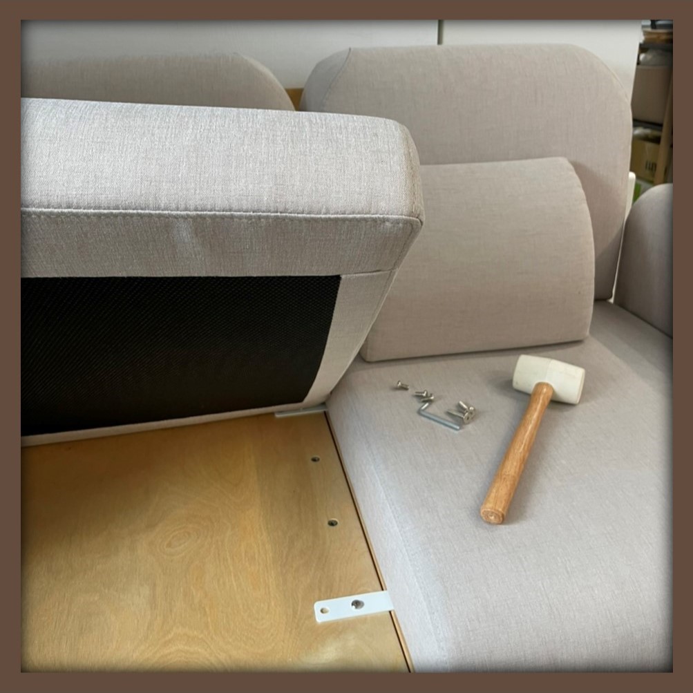 ▲ 最後給大家看看組裝的接頭,就真的是很簡單的螺絲拴一拴,槌子是給板子卡榫設計用的,只要對準凹槽後用附贈的橡膠槌敲幾下即可,然後這個沙發的坐墊下有設計防滑,而且它真的很不滑,不用擔心會一直連屁股帶墊子掉下去唷~