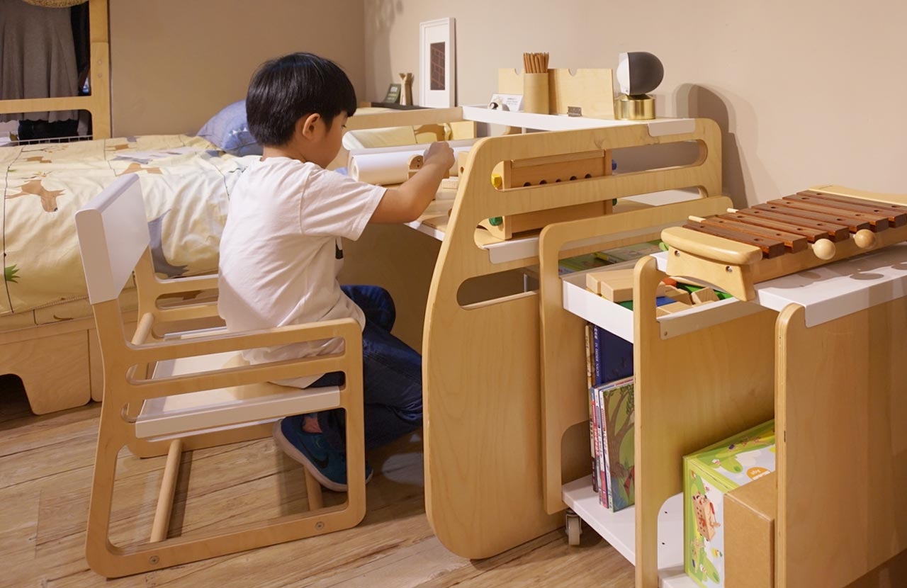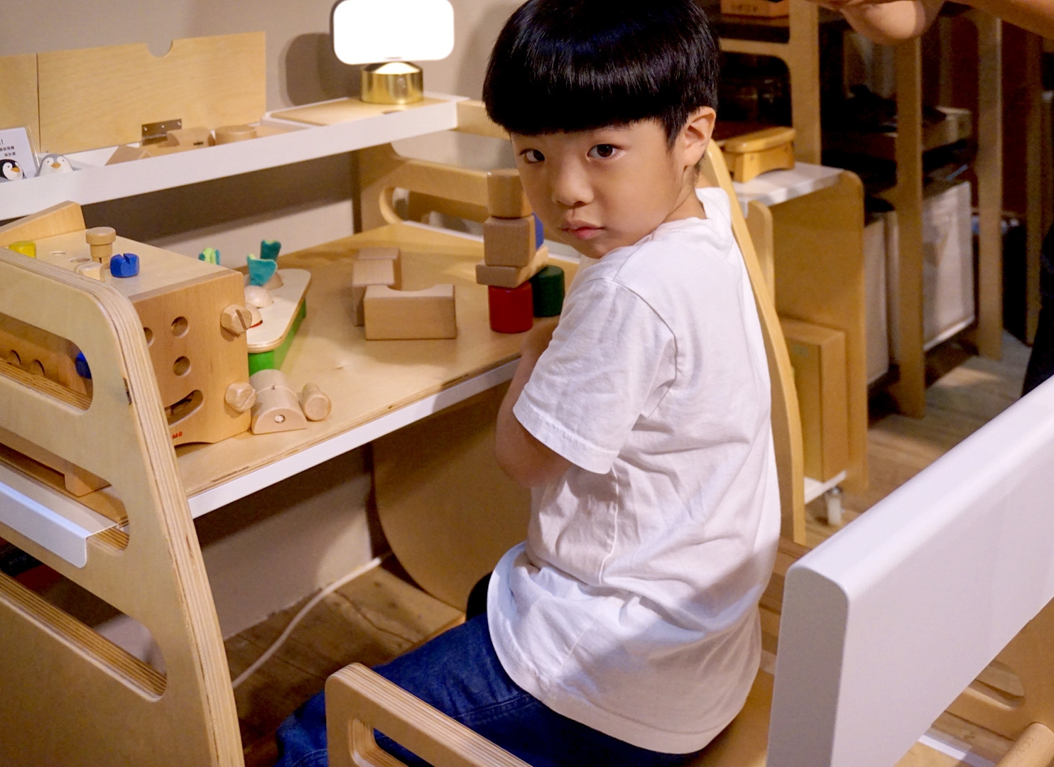 葉揚為兒子羅比選用長版的兒童成長桌椅,和羅比一起玩玩具及陪讀。