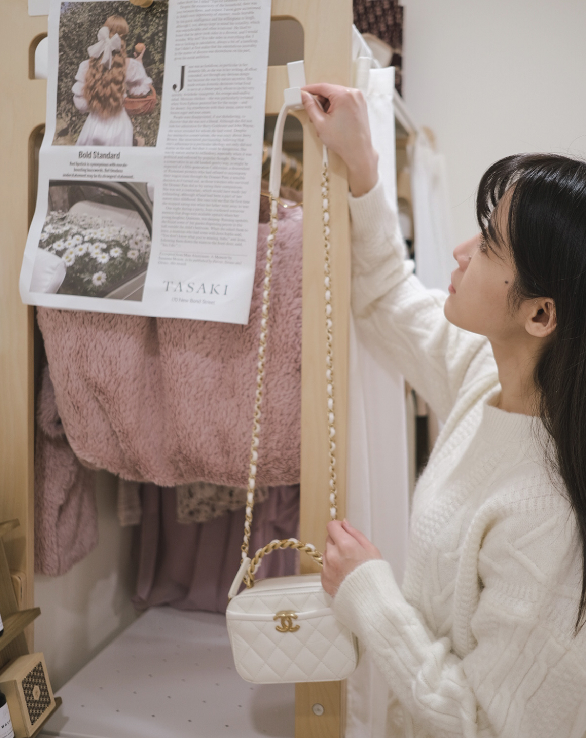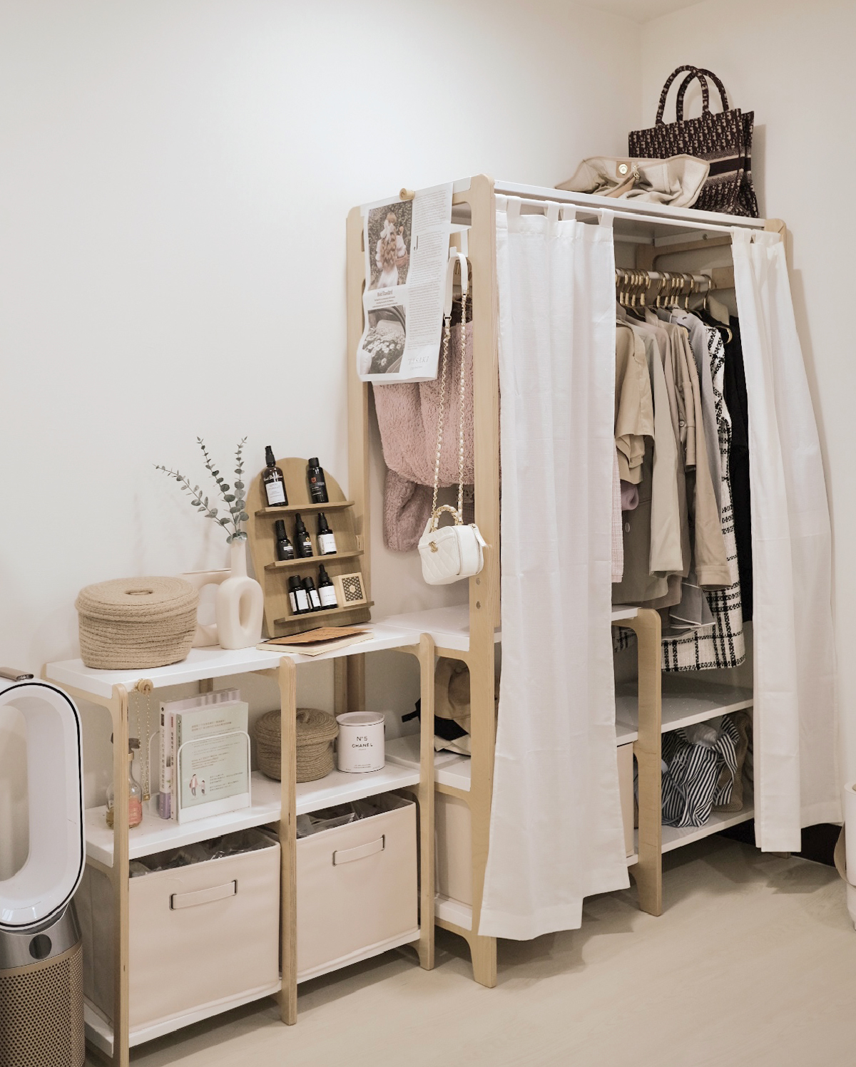 ▲ 衣架掛上洋裝和外套,上衣、下身就搭配布籃來收納;置物架除了擺放質感小物,也收納我平常閱讀的書籍,下層一樣是使用布籃,就算收拾雜物視覺上也是整齊乾淨,算是一個偷吃步的收納技巧。