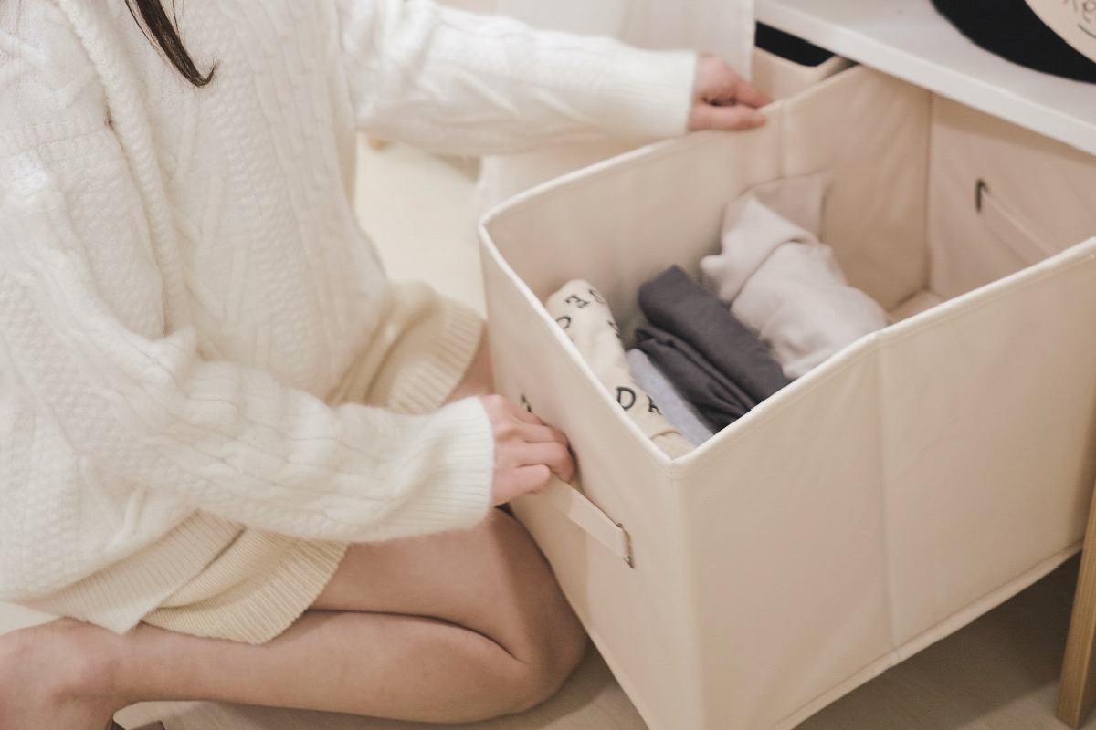 ▲ 下層搭配走走布籃來收納,長方形的尺寸很適合「直立式摺法」,上衣、褲子摺好放進去,拿取挑選不怕亂,是很方便的收納技巧~而正方布籃我拿來放新衣服,使用上因為兩邊都有把手,所以拉取很輕鬆,材質也比一般的布籃還要硬挺耐用。
