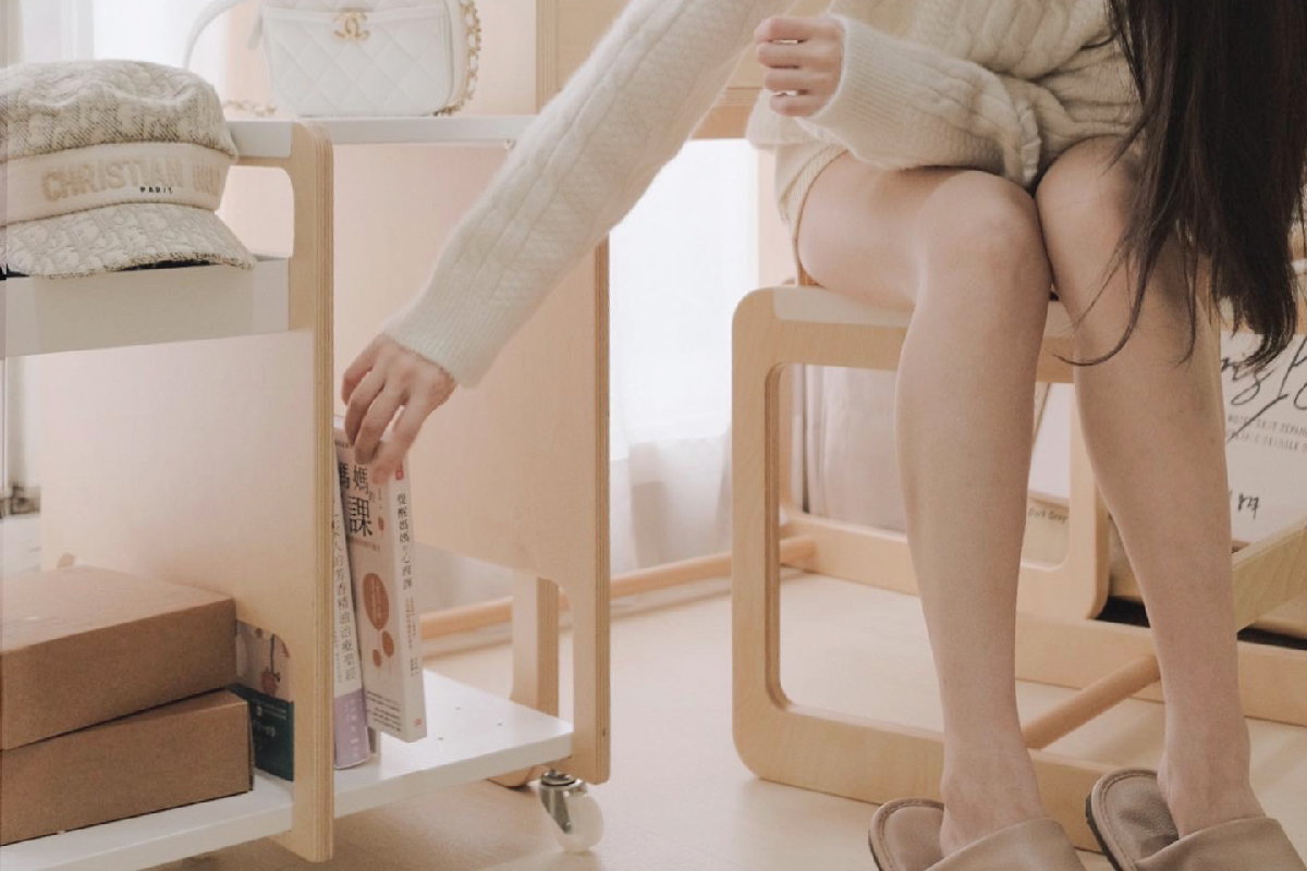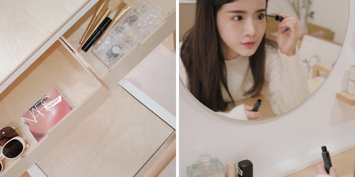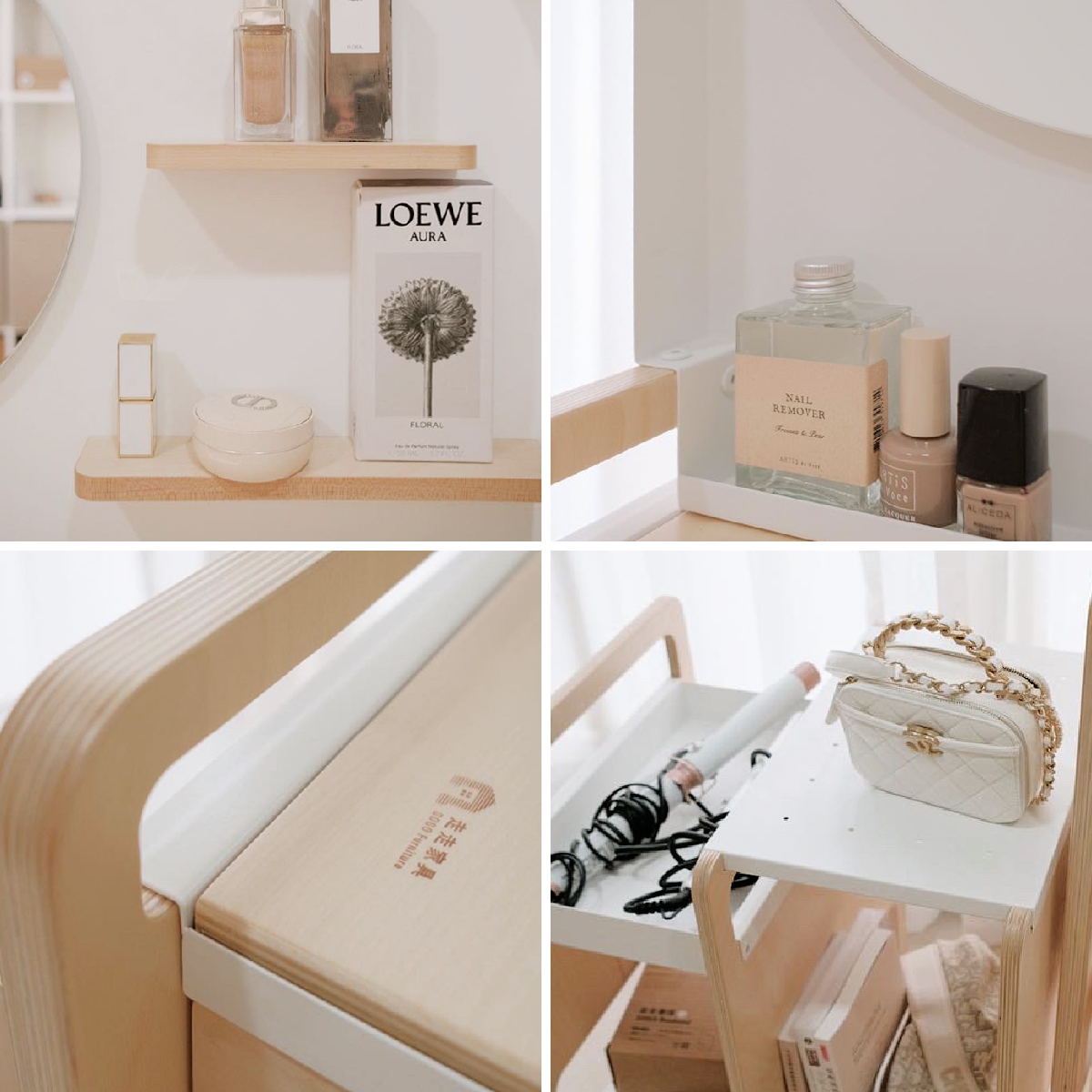 ▲ 我使用走走化妝桌椅組+移動邊架,來收納滿滿的化妝品,化妝桌椅的設計很精巧,處處充滿小巧思,白色的實木材質視覺上很清爽,光用看的心情就很好(笑)