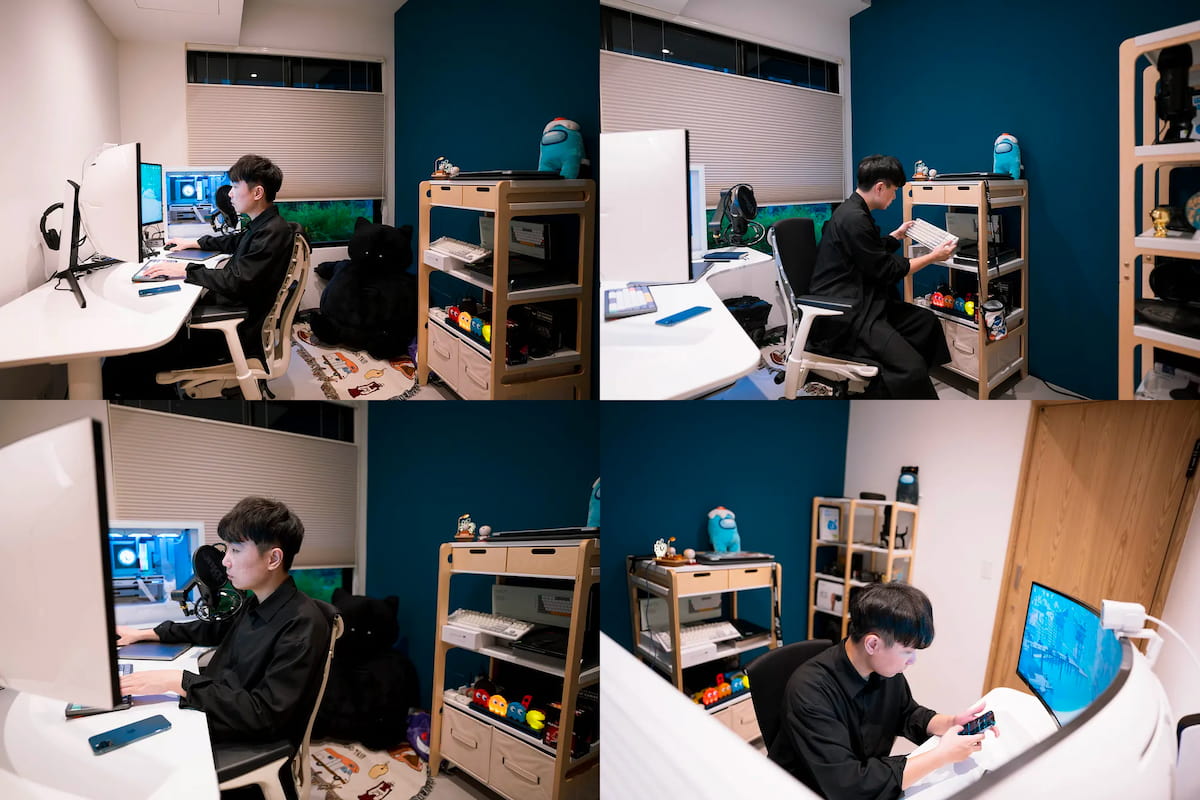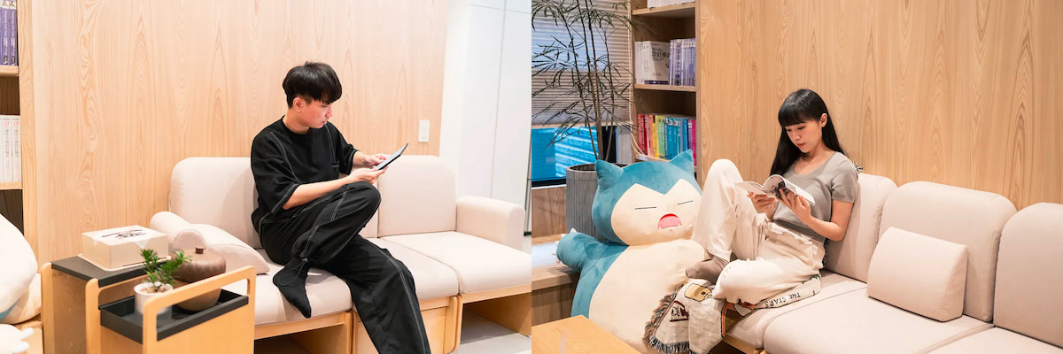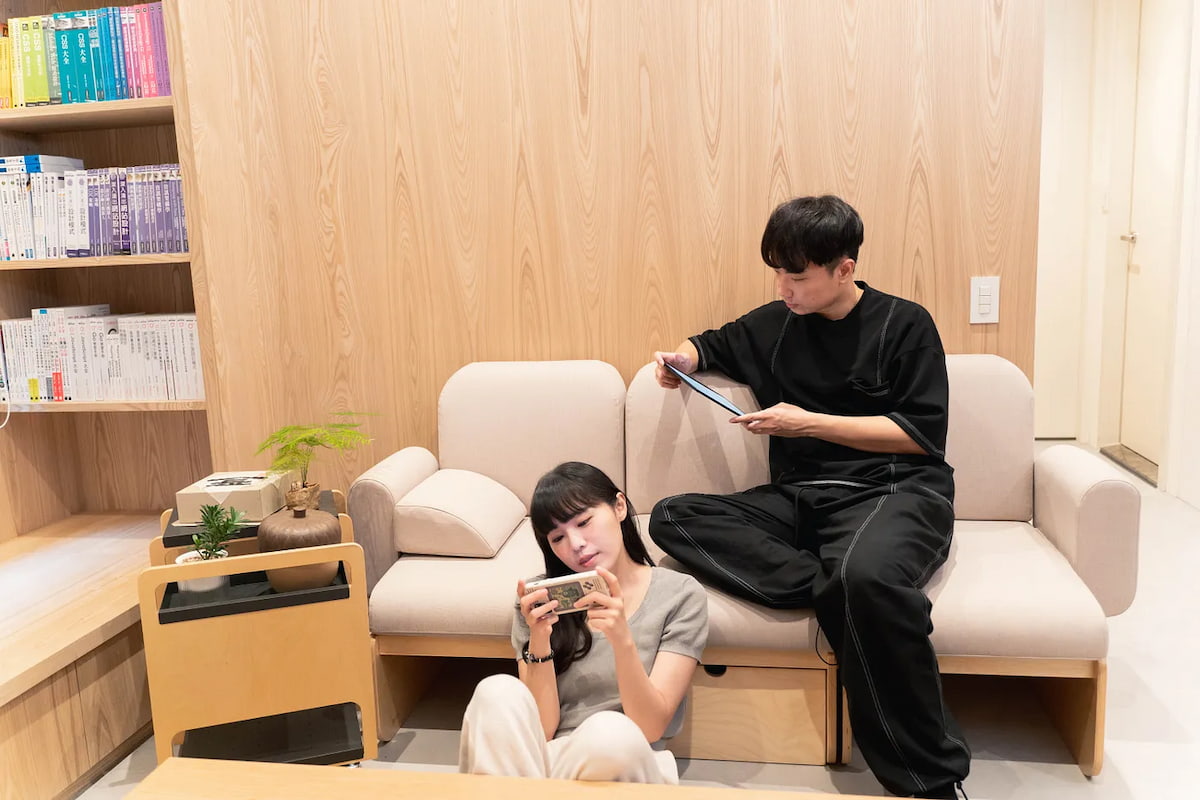 在客廳部分我們併了三個「走走模組沙發」,坐起來的感受很像是賽車電競電腦椅,配色上相當好搭配,事先並沒有模擬過放進新家的樣子,實際進場後發現跟木表面牆壁搭、跟灰水泥地板搭,一旁放了巨大卡比獸娃娃也無違和。