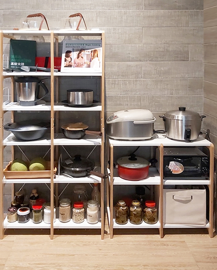 因為平常鍋子都收在廚櫃裡,有時很難找,又不方便,所以才想放在走走高架,容昜看見也方便拿取,一方面還可以展示我的料理好幫手,下面瓶瓶罐罐也容昜被我看見,玻璃瓶裝食材看了真療癒。