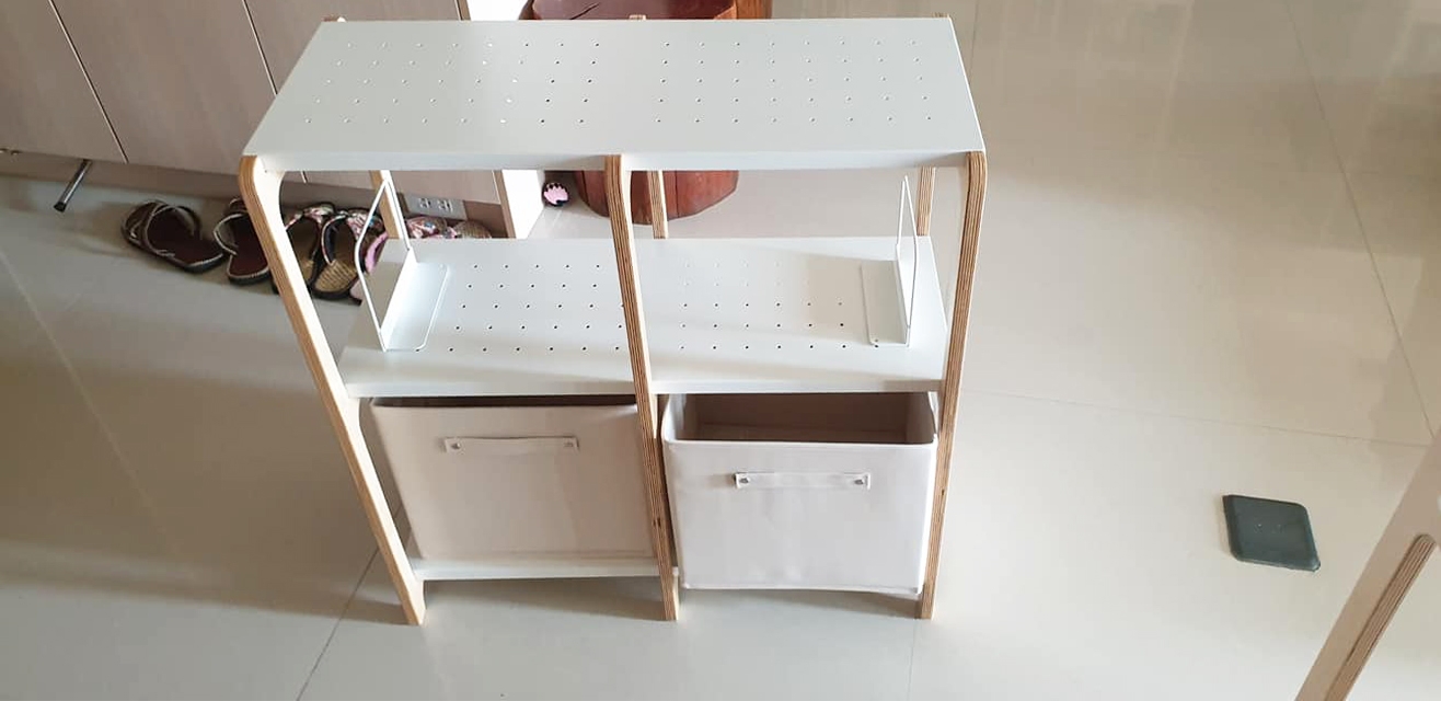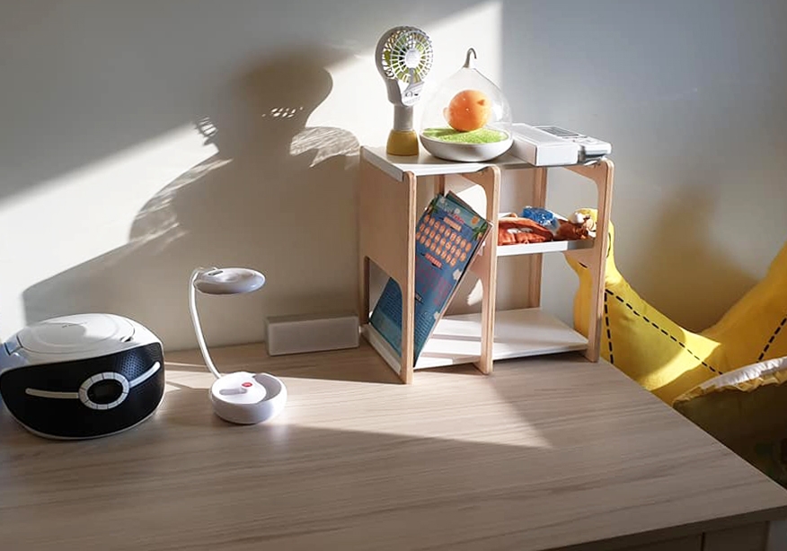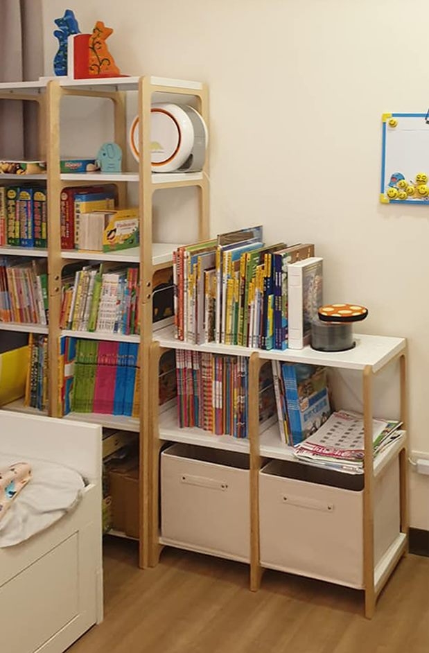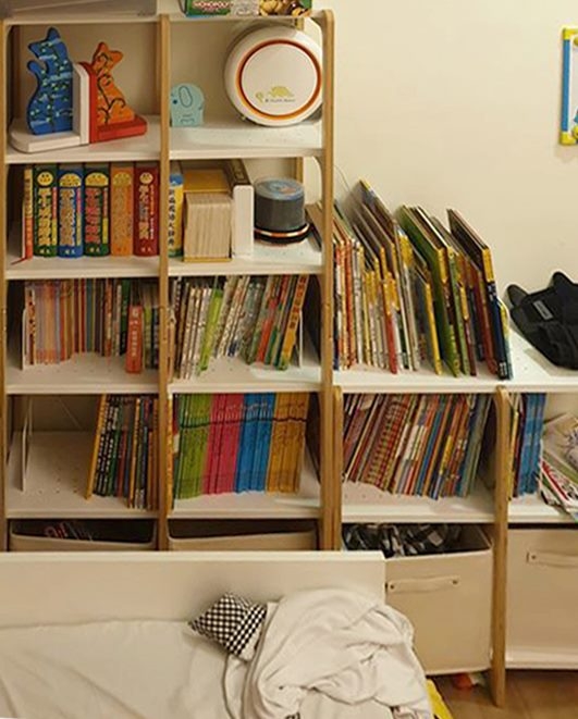 挑選走走的原因是因為想買淺色的家具配合原來的裝潢,挑了很久覺得走走材質好顏色我也喜歡,未來小孩大了要更動也方便,小坪數房間開放式書架也比一般的視覺上寬敞一點。