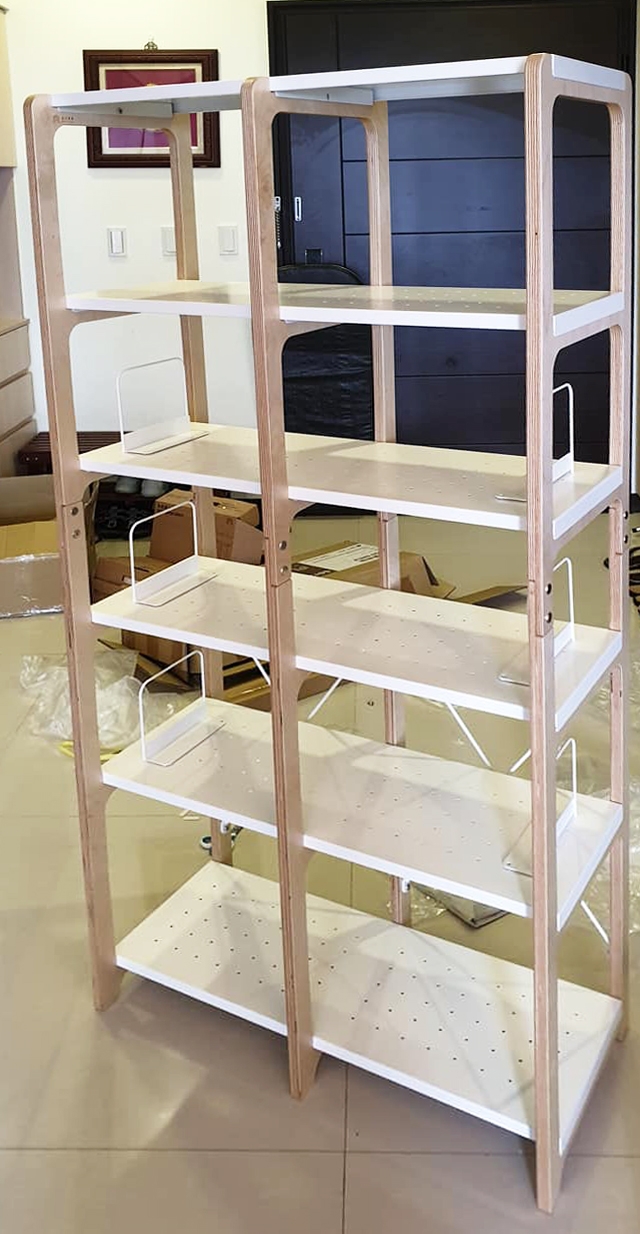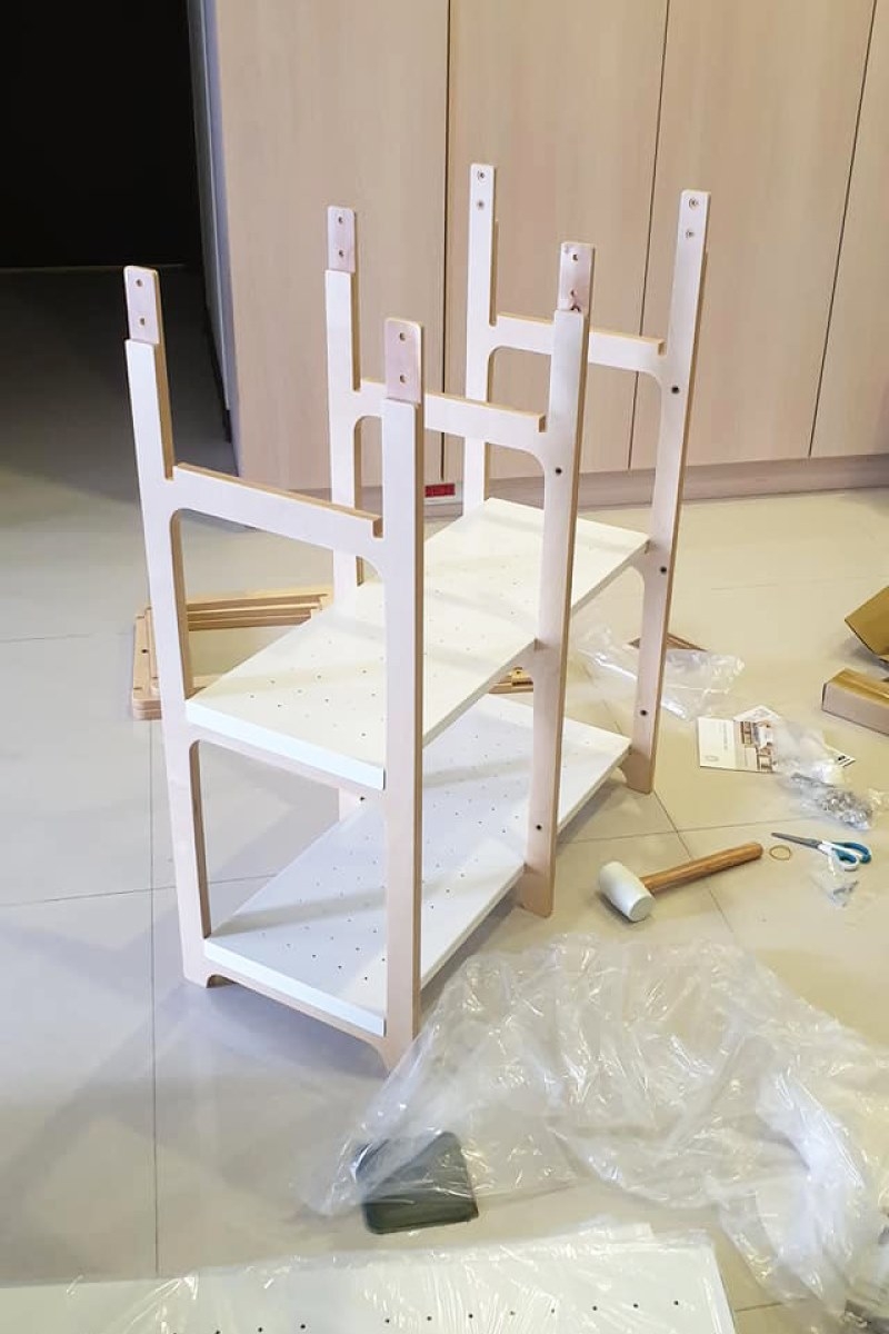 我沒發現高架有附書擋,又另外買了4組,有點太多了XD,全部我一個人組完,很容易組裝,其實也不太需要錘子,我都用拳頭敲(比較快),是很友善女生的DIY!