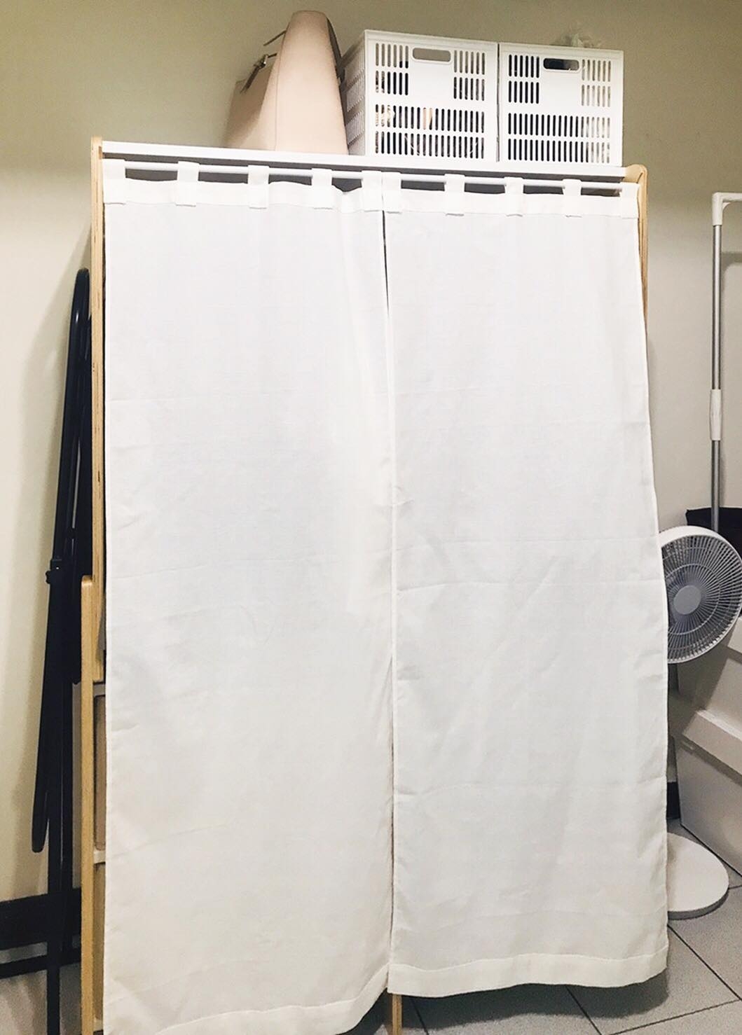 其實 BA 配置差不多,但現在只要拉開布簾就一目瞭然了~以前還要把兩扇門滑來滑去,很吵XD大家有發現,我把洗衣籃也歸納進來了嗎?走走衣架體積比較小,但收納功能更強了,我連換季衣物都可以集中放進來。然後下面墊高的部分,掃地機器人可以通過。