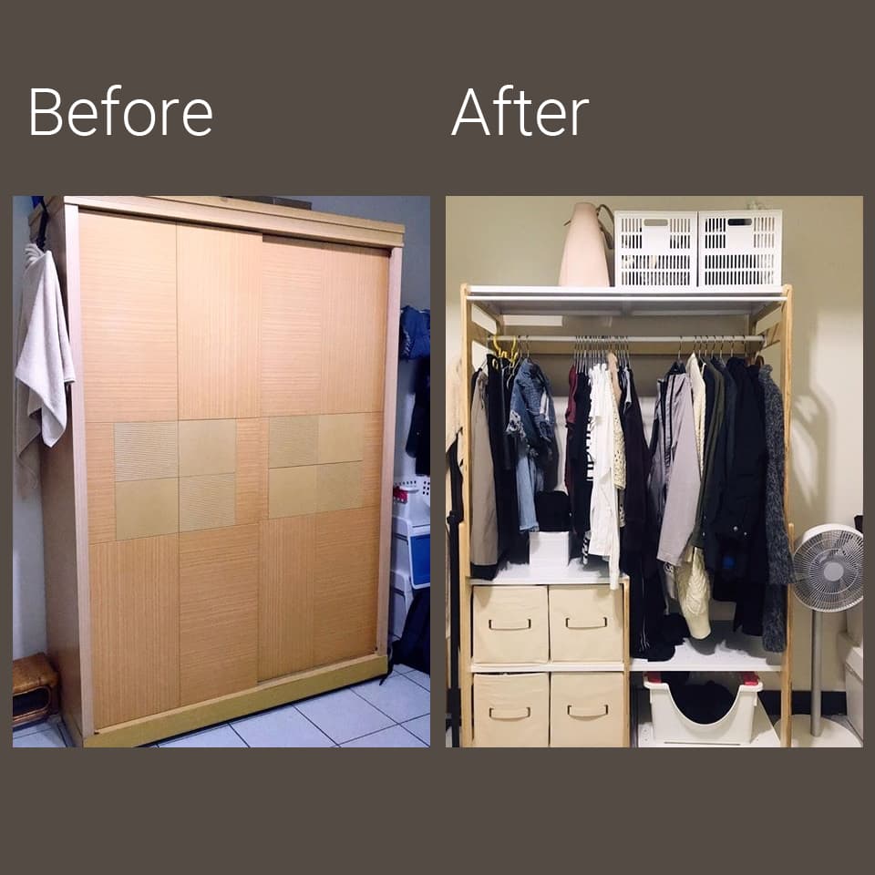 ▲ B:很大很高,而且滑軌已經快不行的衣櫥。我現在衣服真的沒多到要這麼大一個。A:美美又輕巧的走走衣架,收納空間剛剛好,而且因為比原本衣櫃窄,所以我這面牆的空間可以拿來收電風扇,全身鏡(最左邊)也終於可以出動了。