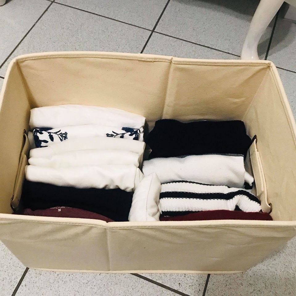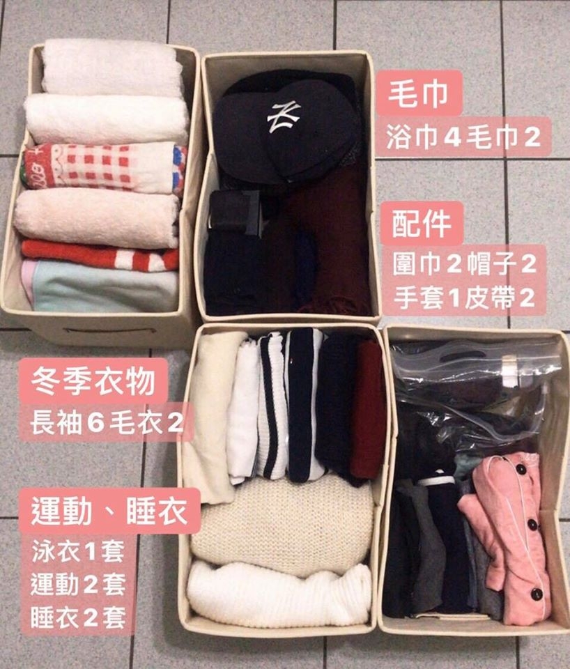 ▲ 同場加映:因為長達一個月要去寒冷的遠方,所以我出國前進行了一個換季的動作,把夏天衣服,還有沒帶出國的衣服收進籃子內。夏天衣物比較薄,所以折起來高度大概是籃子的一半,建議用口袋式摺法,下次要拿的時候比較不怕亂。