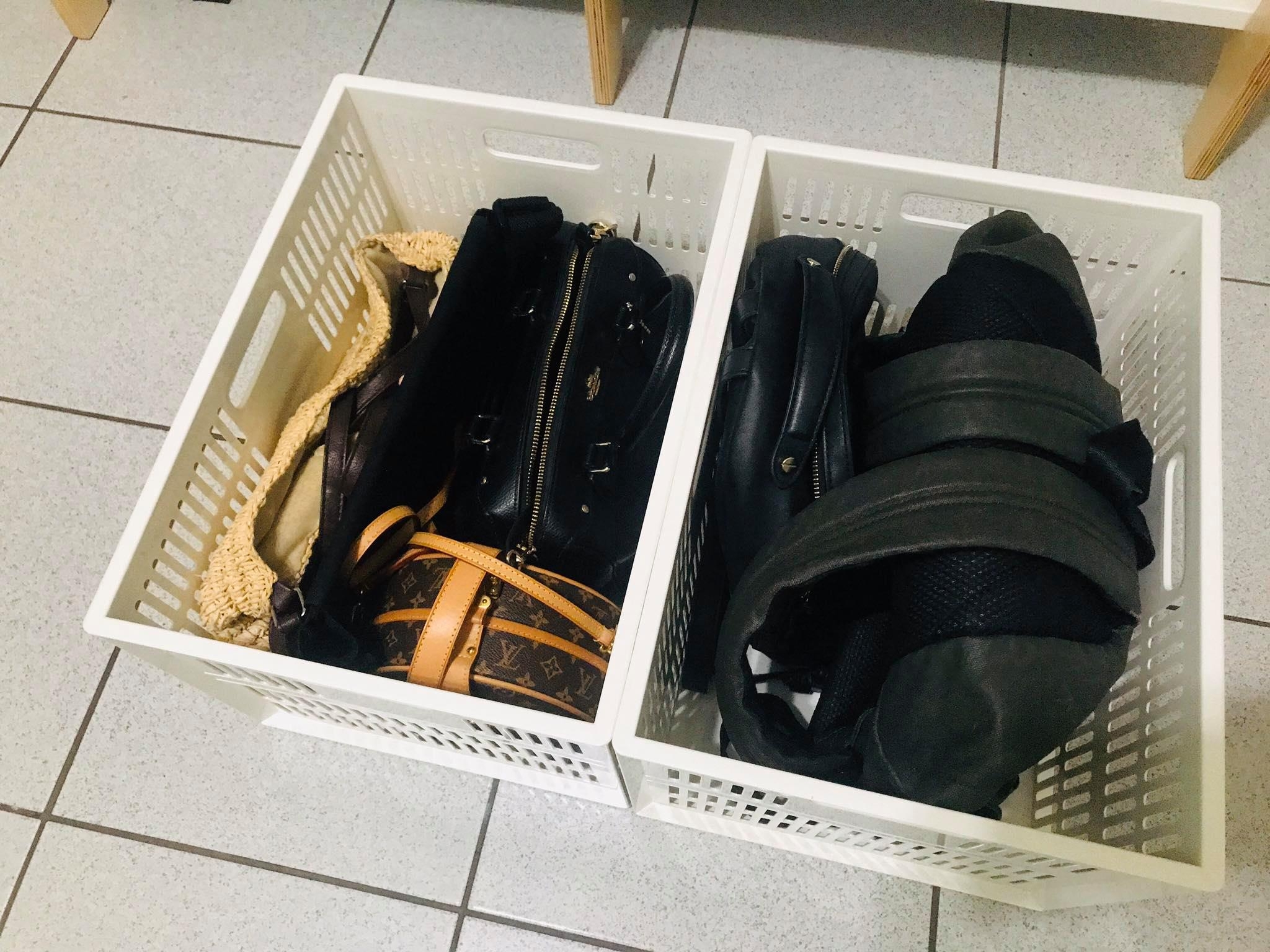 ▲ 原本用來放毛巾跟包包的白色塑膠收納籃,現在是包包的家,一個放肩背包,另一個放後背包。很多客戶會苦惱包包的收納,我還是老話一句站起來就對了!